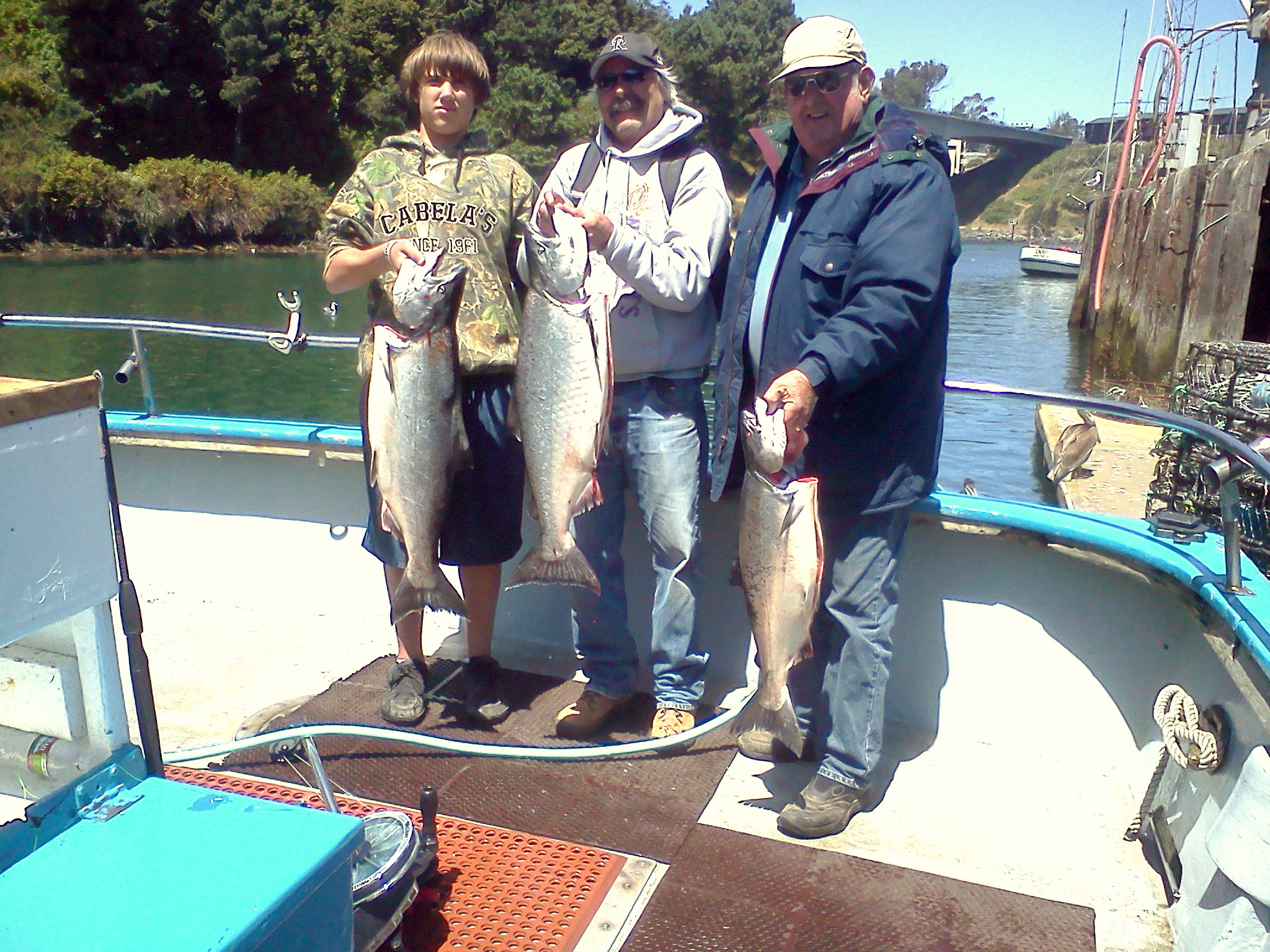 We found a few salmon today. As you see, the grade was nice today. Biggest one weighed in at 23 lbs! We fished north 6 miles in 100 feet of water on Ten Mile Beach. The water color was great for salmon. Birds and bait all over the place. The salmon were hanging out right by the bottom. The water temp was 54-56 degrees. One of the salmon had been feeding on squid. It’s getting that time of year. Time to go up and fish the mouth of the Ten Mile river. Between halibut, petrale soul, and salmon, I try to get at least one of these per angler. Final score today was 3 keepers, lost a couple of keepers and had a shaker for 11 anglers. Picture from left to right; Shane and Miles Oswald from Ukiah and regular Bob Ruddock from Clearlake. Miles scored the trophy fish today. Good job Miles! Fish-On!