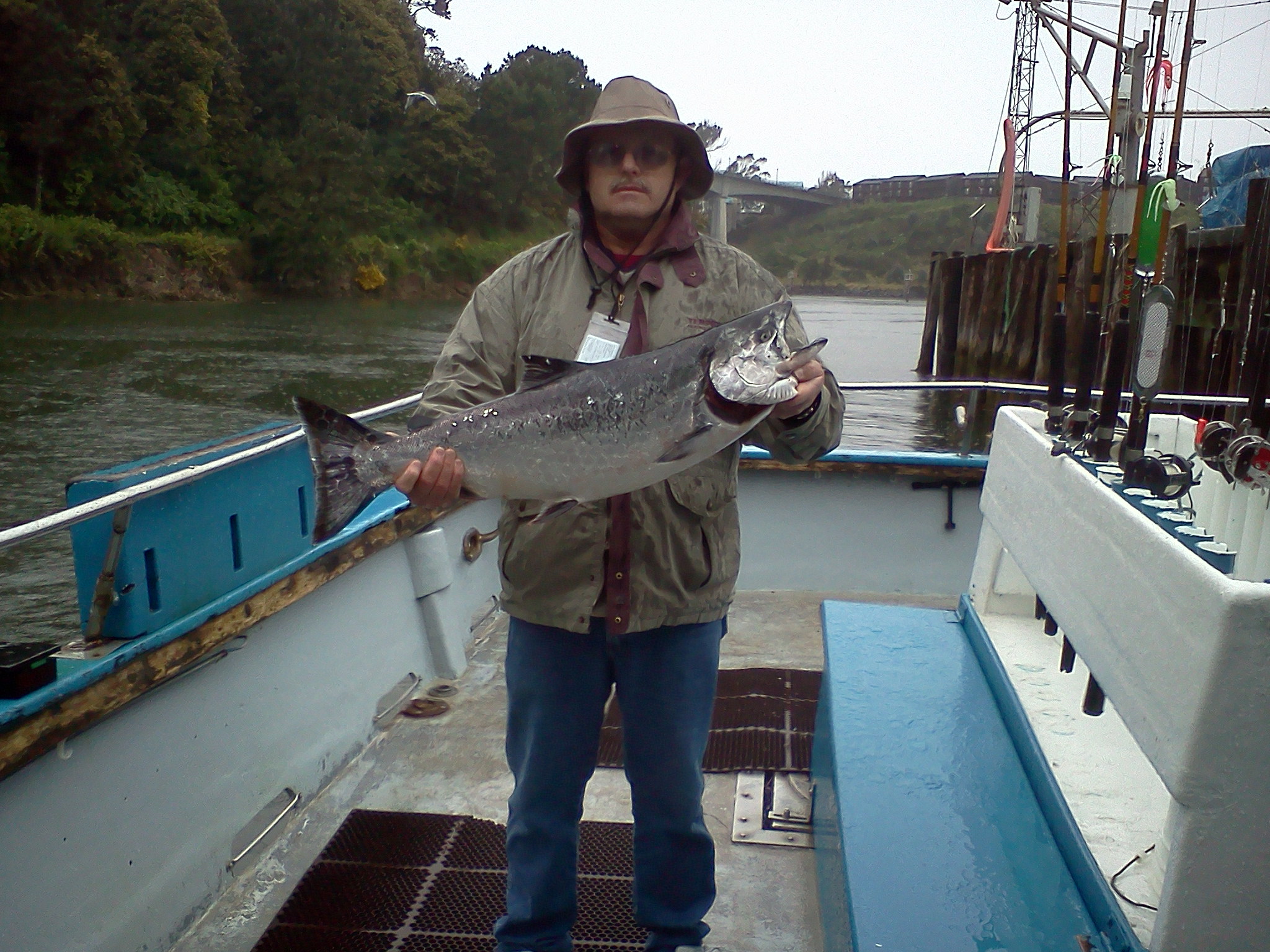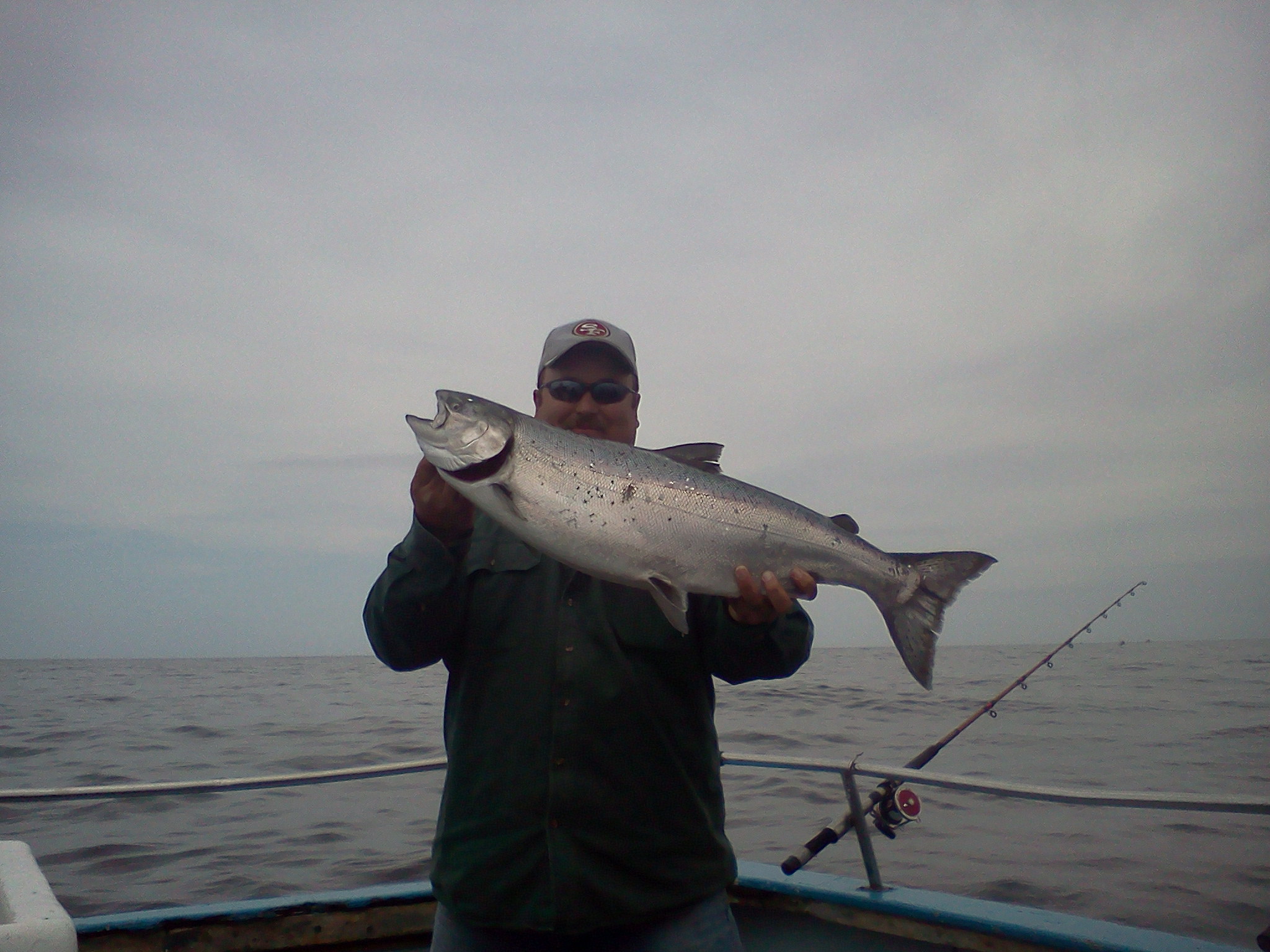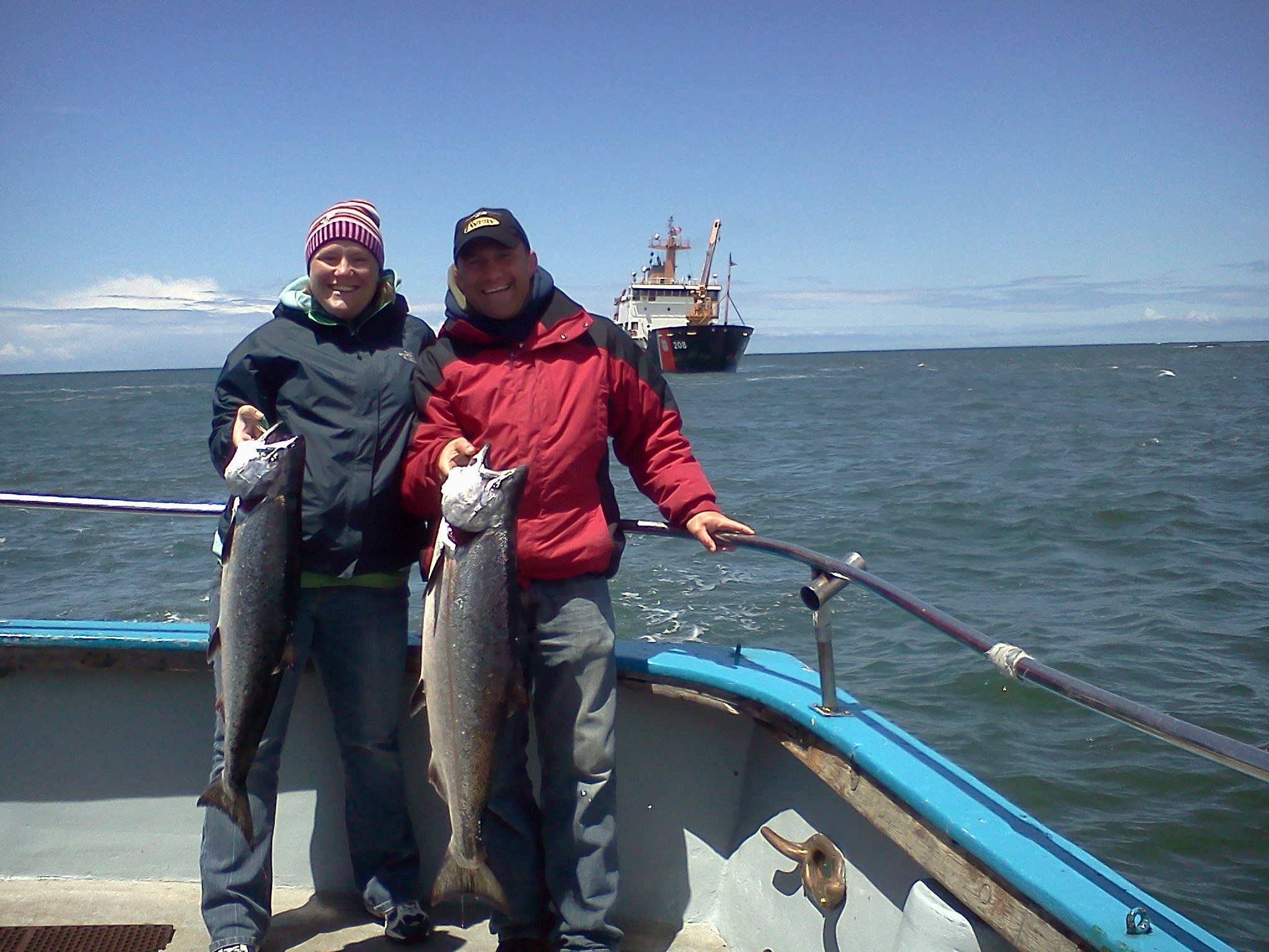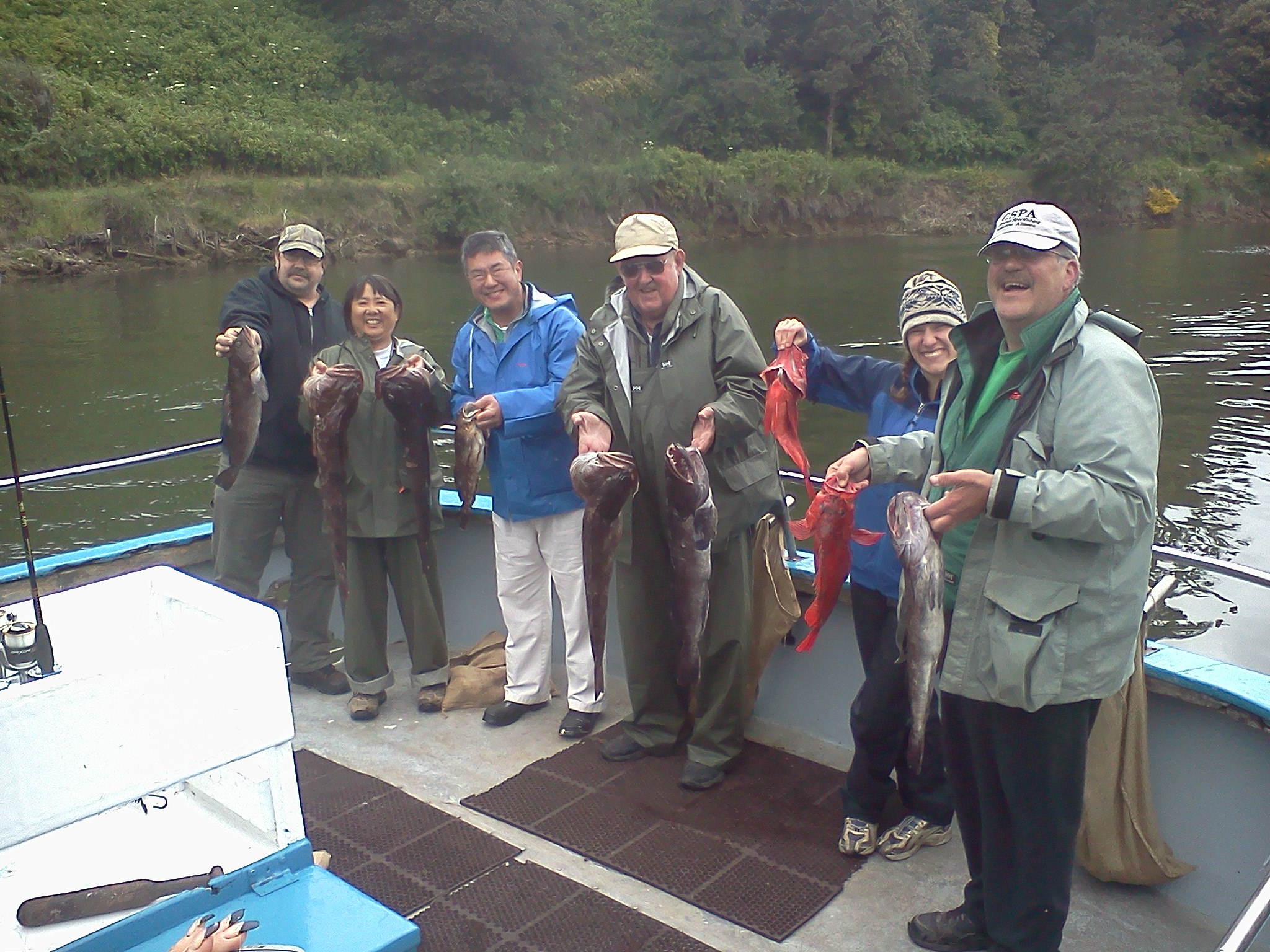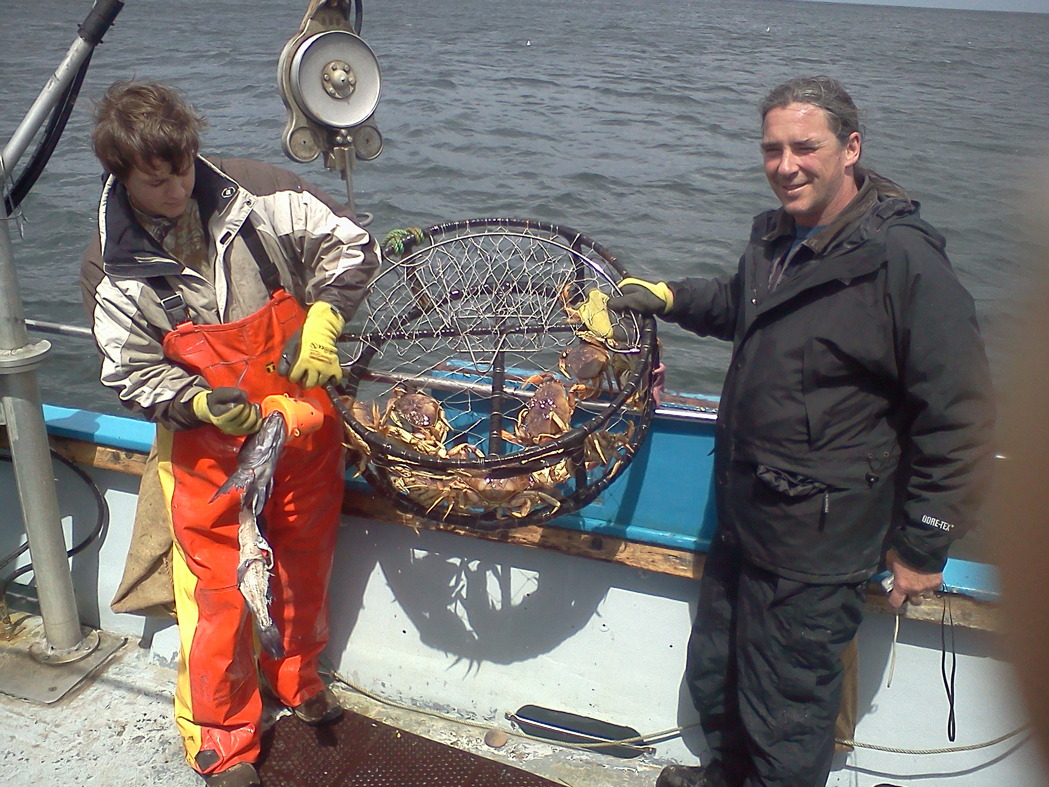 June 4th, 2011– We went out after rockfish and crab today. Some strange weather we’re having. I think we’re still in March. We had an offshore wind today. Usually 20 to 30 kts. The ocean was flat, but the drift was strong. First thing we did was head up to Ten Mile Beach to get our crab pots fishing. Then we went to try our luck at some rockfish. If you worked your gear, you could get some fish, but it was tough. The grade of fish was excellent. Lots of big blacks and some nice reds too. My thoughts were that the winds were going to blow through early so at 10:00 I decided to go run our crab pots and maybe give some time for the winds to die down. The pots yielded good counts. On our first run we scored 74 crabs out of 20 pots. Not bad for a 2 hour soak. When we got back to our rockfishing grounds, the wind was blowing even harder. We fished for another hour and a half and returned back at the crab grounds to stack our pots. We added another 55 crabs to make our grand total 129! Just over 9 per person. Final score on fish was about 1/2 limits with 1 keeper ling. Picture; Deckhand Sean Thornton (left) and to his right passenger Shawn Blower out of Willits, Ca. are showing off one of our better pots with 9 keepers and 4 throwbacks. Fun was had by all. Fish-On!