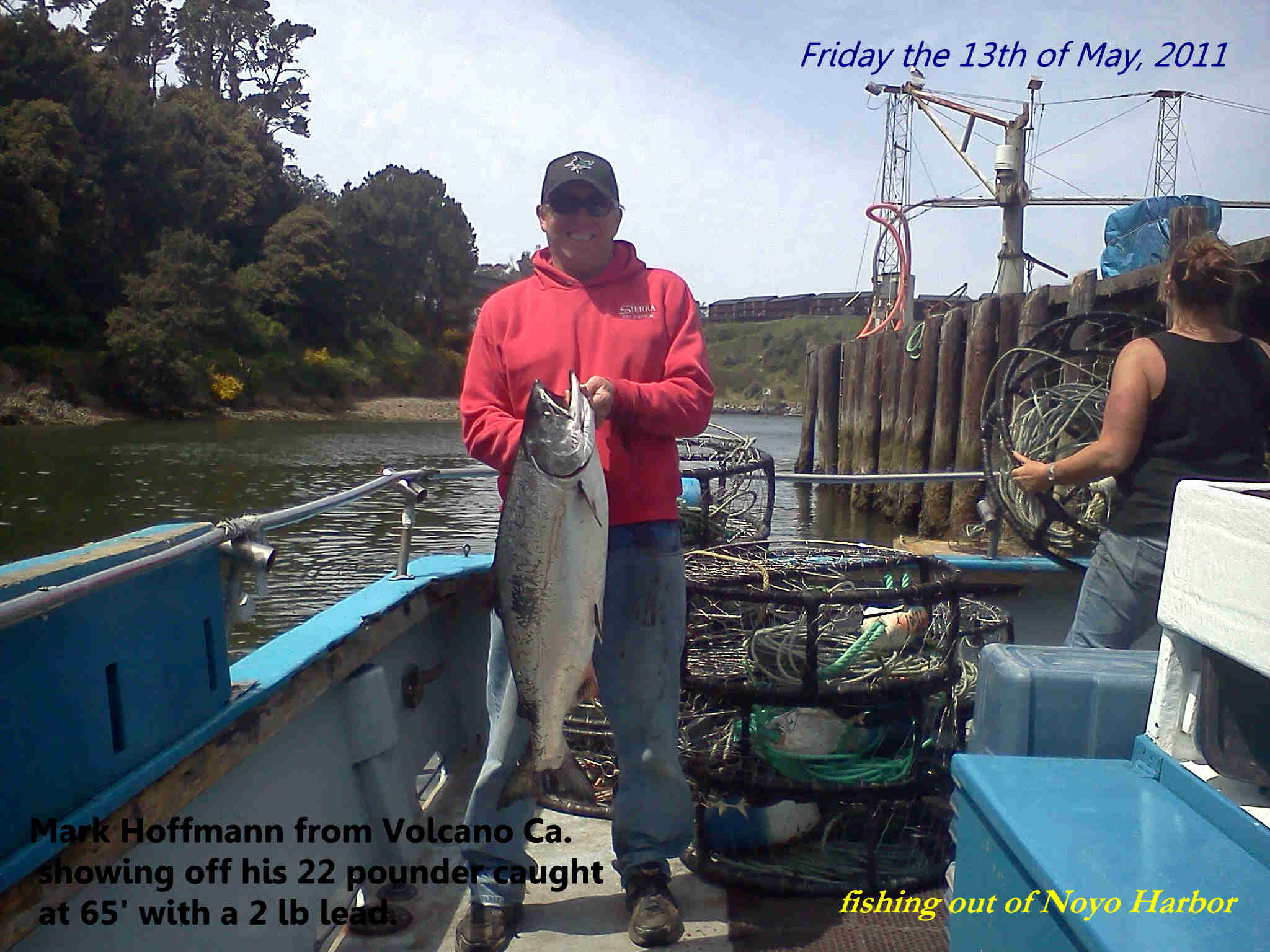 5/13/11– Ocean was calm, winds were light and the sun was worming our bones while we patiently awaited for one our rods to start bouncing. The salmon water is here. Chocalate brown with birds working and good tempurature. All we need now is for some hungry salmon. We were fishing about 1/2 way up the beach (6 miles north) in 200-250′ of water. We landed one fish (nice one), lost one due to the handle of the reel fell off, released one shaker and one silver. After our serious effort, we resorted to our crab pots. I had my pots in 30-35′ on the beach and they produced well. A bit slower than I expected but we ended up with 8 around for 10 anglers. Not bad for a bad day of crabbing. I think the fish are here just not hungry. Maybe tomorrow. I’ll keep you all posted. Fish-On!