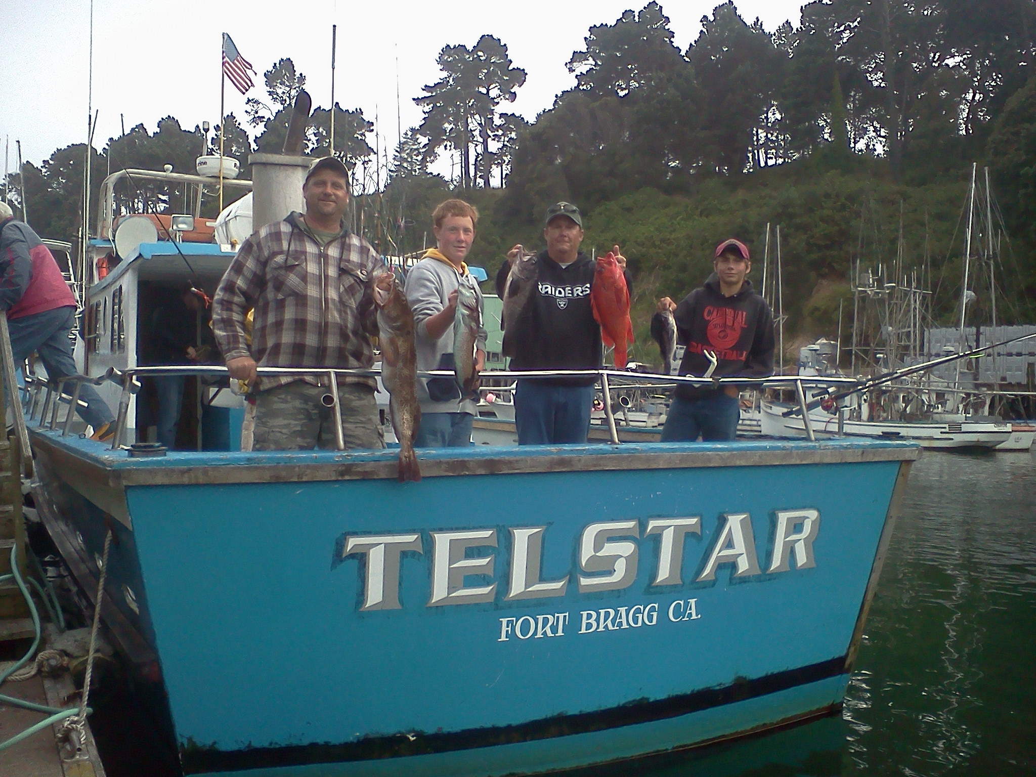 The Telstar* fished for salmon on the morning trip. We ended up with 3 fish for 11 anglers. In the afternoon we went after rockfish. We had a better luck. We fished down south off the Yellow house in waters ranging from 80 to 25 feet. We had a nice variety with some big reds and 8 lingcod. Pictured here are just a few of the happy fisherpeople showing off their catch. Overall score was 7 to 10 fish per bag for a boat load. Fish-On