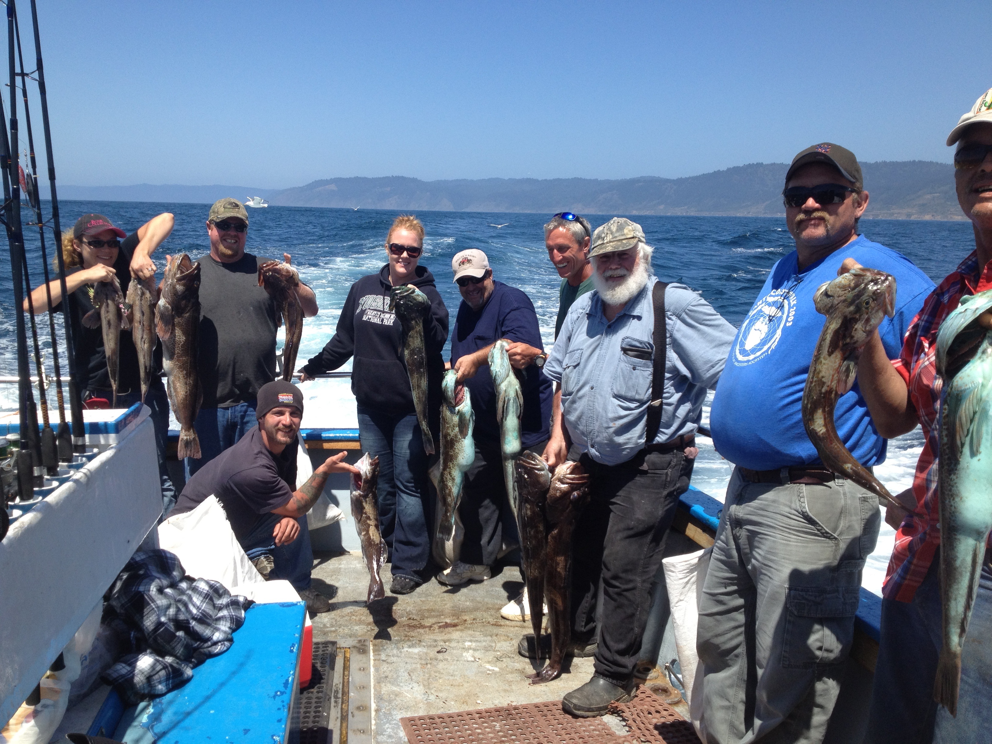 Sunday July 29th, 2012– We did a 3/4 day trip up north looking for bigger and better fishing. We found just that. The ocean was calmer than down close to home port. The sun was shinning and the winds were calm. Oh yea, the fish were biting too! We ended up 16 miles north of Fort Bragg off of Abalone Pt. in about 70 to 90 feet of water. It wasn’t a wide open bite until towards the end. We ended up with limits of Lings and limits of rockfish for 13 anglers. We fished light tackle. 15 to 20 lb test line with spinning reels and baitcasters with 3 oz jigs and a teaser hook above. The lings were snapping so good, we were catching them two at a time. Great fun with great people! The biggest ling was 17 pounds caught by John Wilkens out of Branscomb Ca. Runner up was a 14 pound ling landed by Roy Wade also from Branscomb. Great job everyone! Fish-On!!