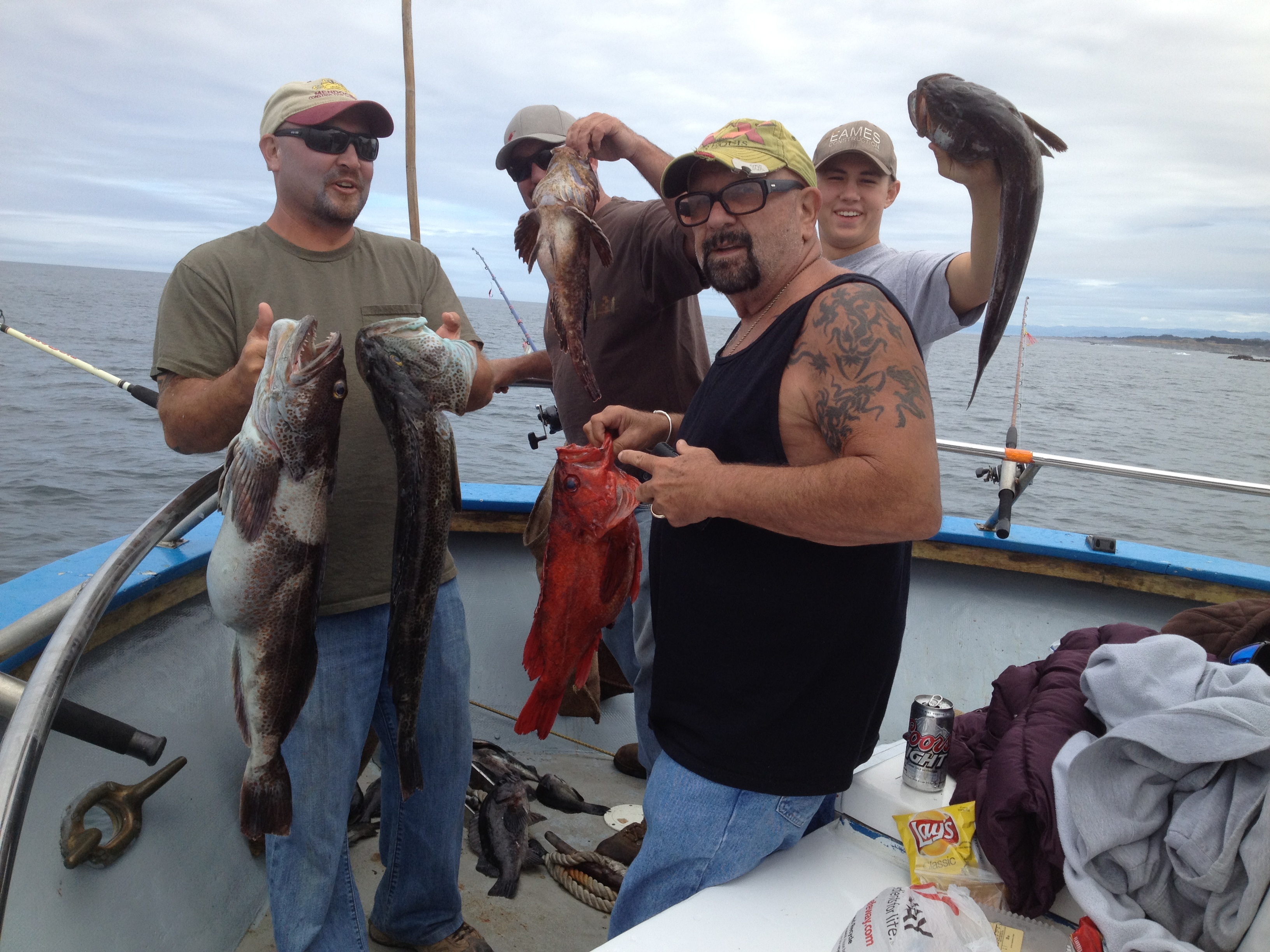 6/30/12– Today was a repeat of yesterday. Rockfish in the morning down in Mendocino and salmon in the afternoon up north. If we didn’t get limits in the morning we were real close. Still a beautiful ocean but the winds are expected to come soon. On the left from left to right; Jimmy Payne, Rich Dutra, and Dray Payne all from Ukiah and Jim Payne from Lubbick Tx all had nice bags of fish and lots of lings too. Nice job guys! Capt Randy