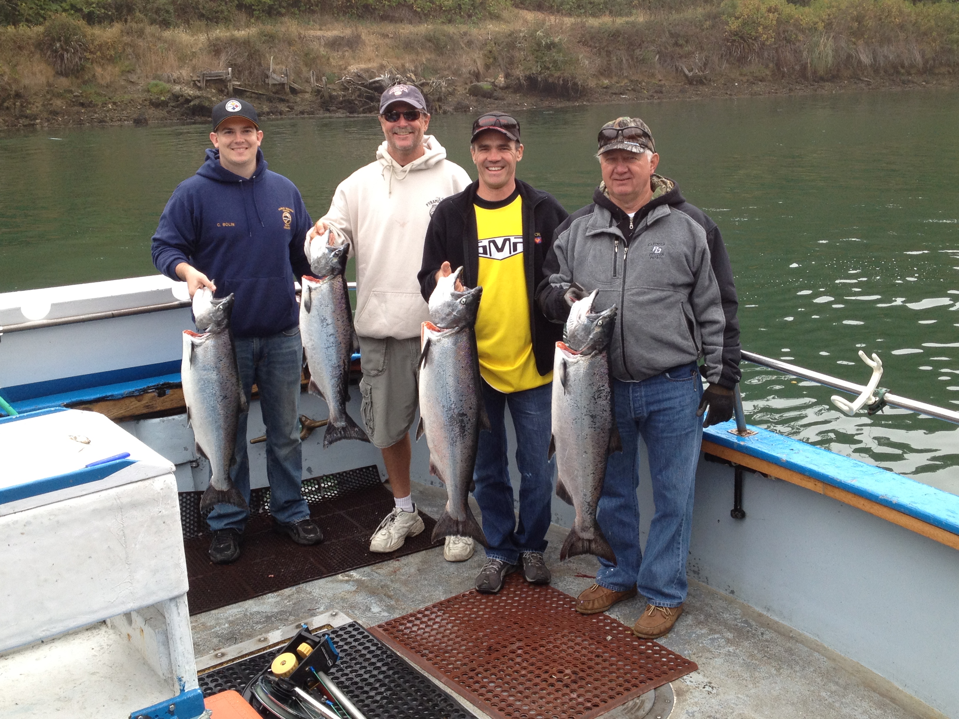 In the afternoon — we found some salmon that were hungry. We fished about the same place as Thursday. The fish were biting the jail bird hoochie over a cut anchovy behind a flasher at 35 to 45 pulls with a 2 lb weight. We landed 4 nice ones and lost 1. Picture; Cliff Bolin/Paradise-17 lbs, Michael Macarthy/Chico-14 lbs, Joel Burkett/Paradise-25 lbs, and Jim Dally/Paradise-20 lbs. Fish-On!