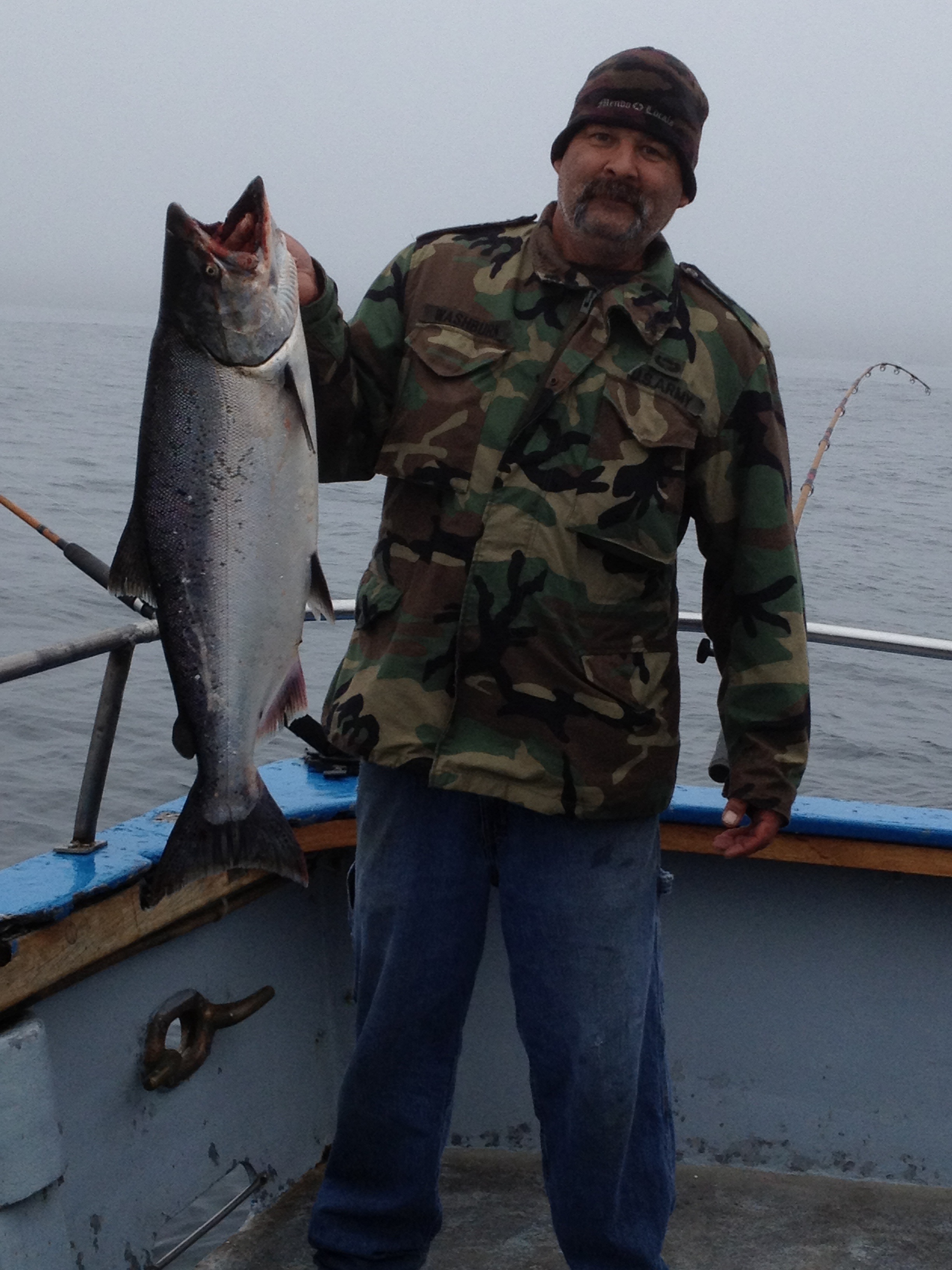 9/16/12 — The salmon fishing has been scratchy, which is typical for this time of year. There are lots of fish still being caught but you have to be at the right place at the time. Today, Kelly Washburn from Ukiah was at the right place. He landed the only fish for the day weighing in at 23 pounds ! The ocean was nice and the water temp is still good for there to be potential for some good fishing. Fish-on!