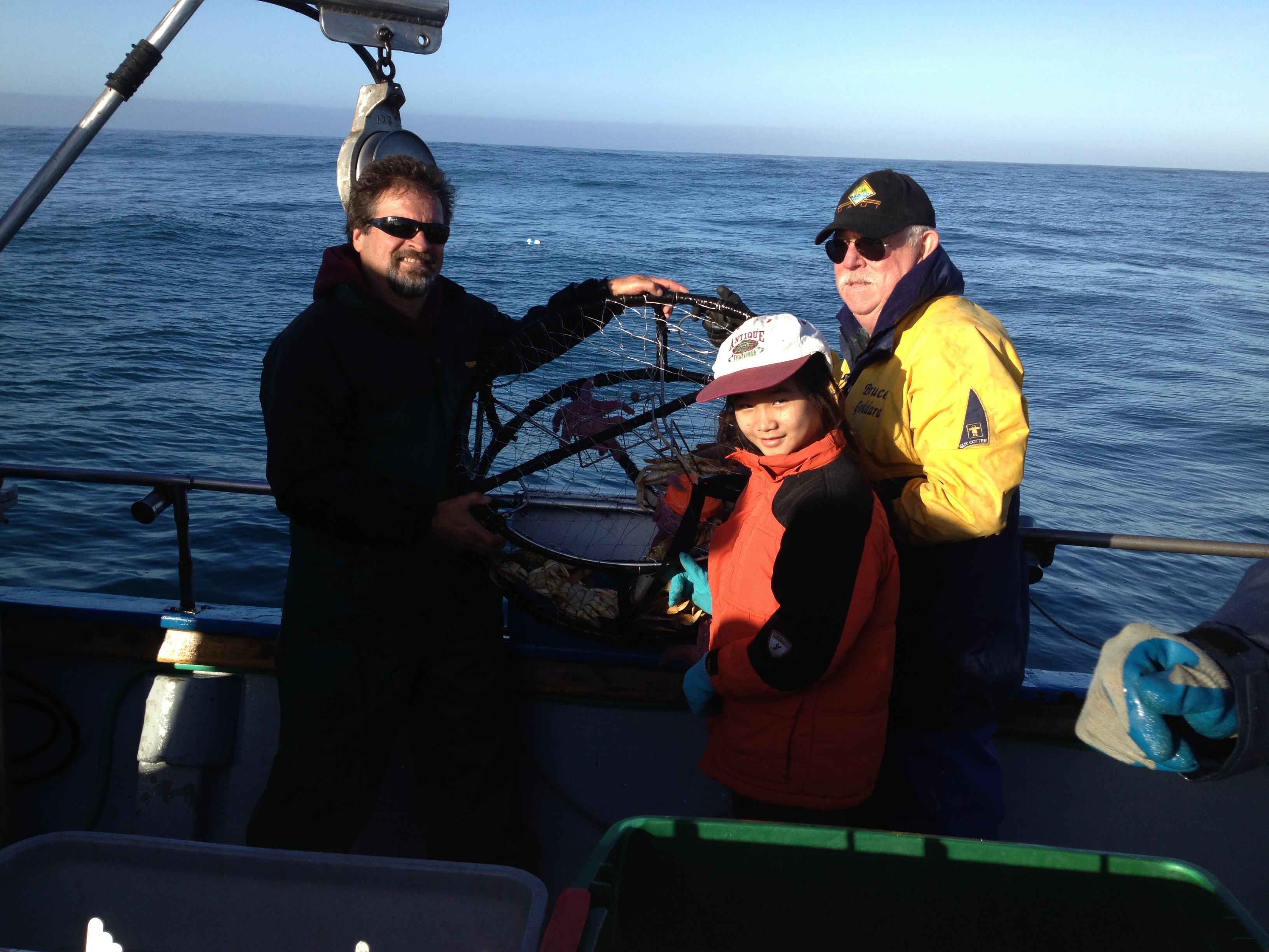 Another good day to be out on the ocean. We ended up with another nice load of hungry anglers looking for some nice big dungenous crabs. We averaged just over 7 keepers per pot. Nice big crabs full of meat! Our best pot was 15 keepers. The swell was starting to build again so we picked up my string of pots in the shallow water and brought them home with us. Tomorrow I have a light load and the outside string should produce what we need. Everybody had fun pitching in. Our end score was 240 crabs for 24 anglers and back at the dock by 11:00. Picture left to right; David Cost from Hilmar Ca., Mary Mulan from Grass Valley, and Bruce Goddard from Mendocino. Is it time to eat yet? Fish-On