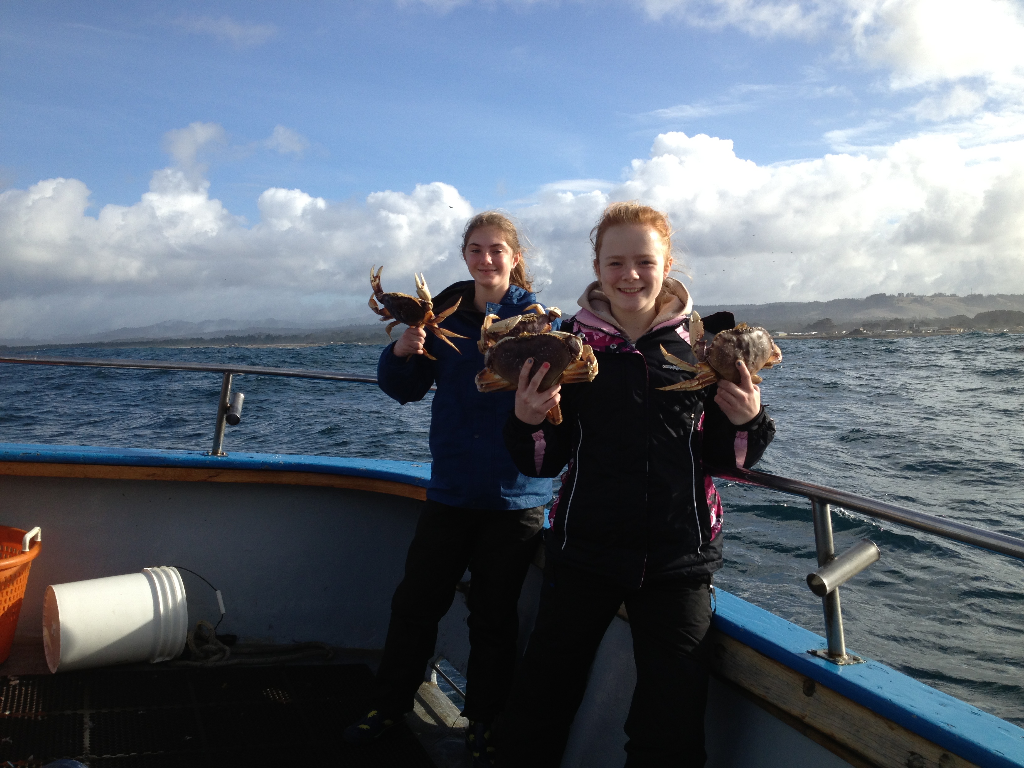 11/21/12– We’re giving thanks today for the weather cooperating with us and for the crabs being hungry. On the way to the boat this morning we had a rain squall come through that must have dropped 1/4 to 1/2 inch of water. The forecast is calling for a pretty good size swell. When everybody was present, I told them that the game plan was to go run our 17 pots that we have out there and come in. So whatever those pots have in them is what we get. We needed 100 crabs to get limits. Well, needless to say, everybody left with 10 crabs apiece!! The rain didn’t show itself and the sun came out. Not only that, we saw our first Grey Whale of the year migrating south. Everybody worked hard today especially (picture left to right) Meghan Guthrie from Yuba City and Tori Escheman from Marysville Ca. Good job girls!! I hope everyone has a very happy Thanksgiving! I know I will. Fish-On!