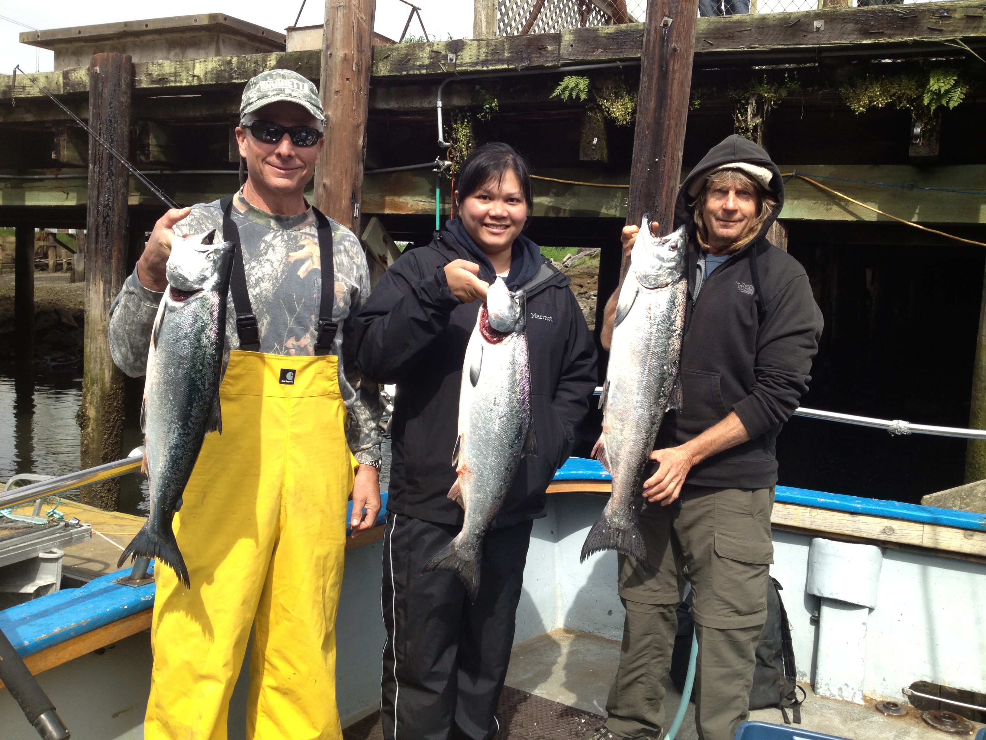4/6/13 report– Telstar* went out today for the first time of the year for salmon. Lots of boats out today, the weather is nice. We’re doing a crab combo so I fished up north by our crabpots. The crabbing was kind of slow (expected this time of year) but we did manage to scratch out 5 crab per person for a full boat. A total of 85 crabs. As far as the salmon fishing went; since we spent the first part of our trip crabbing that gave the other boats time to either find the fish for us or at least let us know where not to go. Well, they let us know where not to go. So I started outside of our crabpots in about 200 ft of water. Lots of bait and bird activity but no bites. So I trolled around, in and out, up and down. It looked good most everywhere. Finally, “hook up!!” Kent Clemenco from Arnold, Ca. hooked into the first salmon of the year for the Telstar* and landed it. Not a bad fish. About a 12 pounder. We were in 140 ft of water just off Cleone Reef. We ended up scoring 2 more and lost one. The biggest catch of the day was a 14.5 lb king caught by Jim Darrow out of Kelseyville. Good job Jim! Everybody enjoyed the day and went home with some nice fresh seafood. Fish-On!