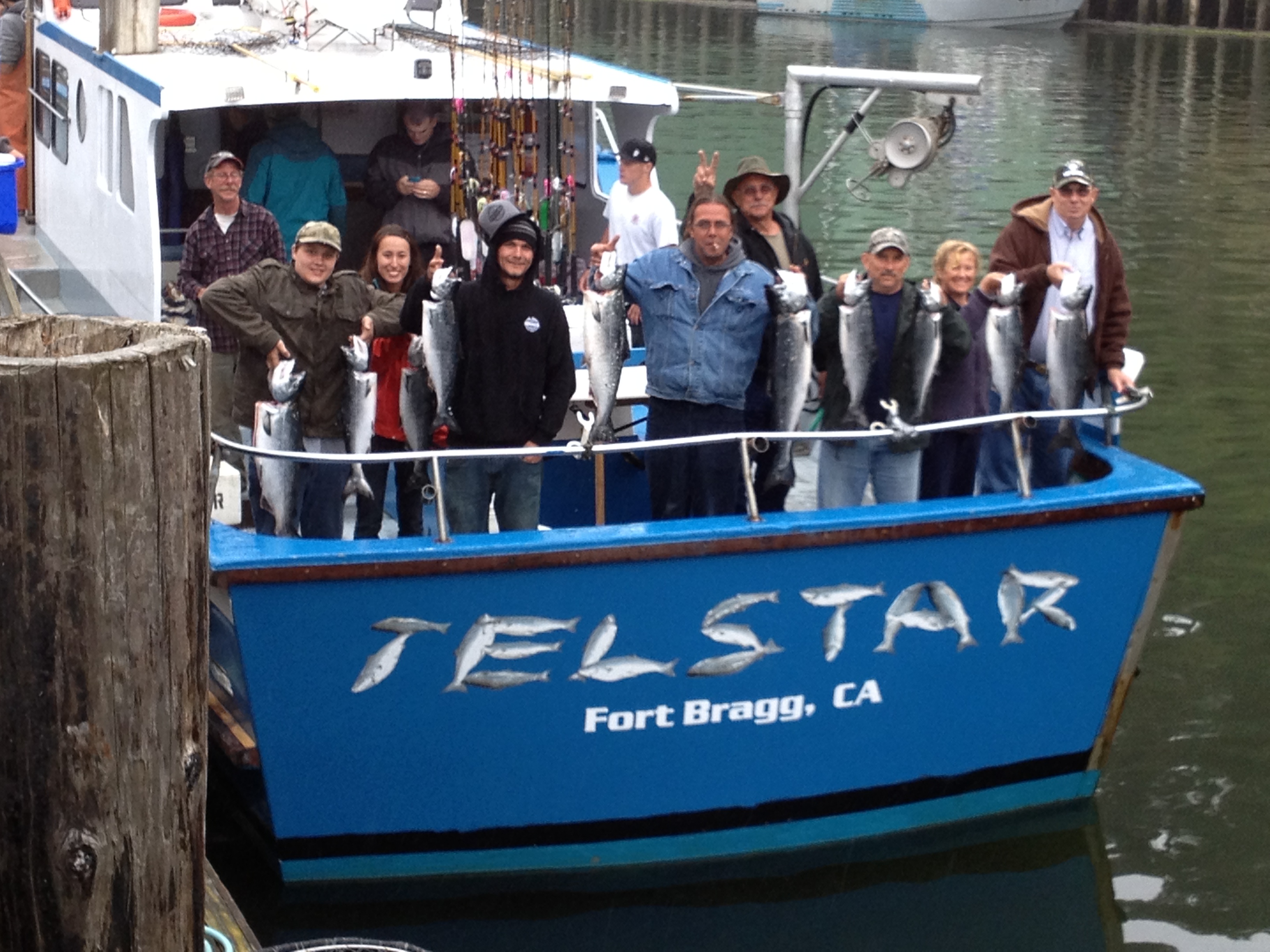 We went looking for a better bite. Earlier I saw the commercial fleet working pretty hard down off Mendocino so I thought I’d go see what they were doing. We had good action. We ended up 10 fish for 13 anglers. We lost a few nice ones too. Picture; some happy passengers on the Telstar*