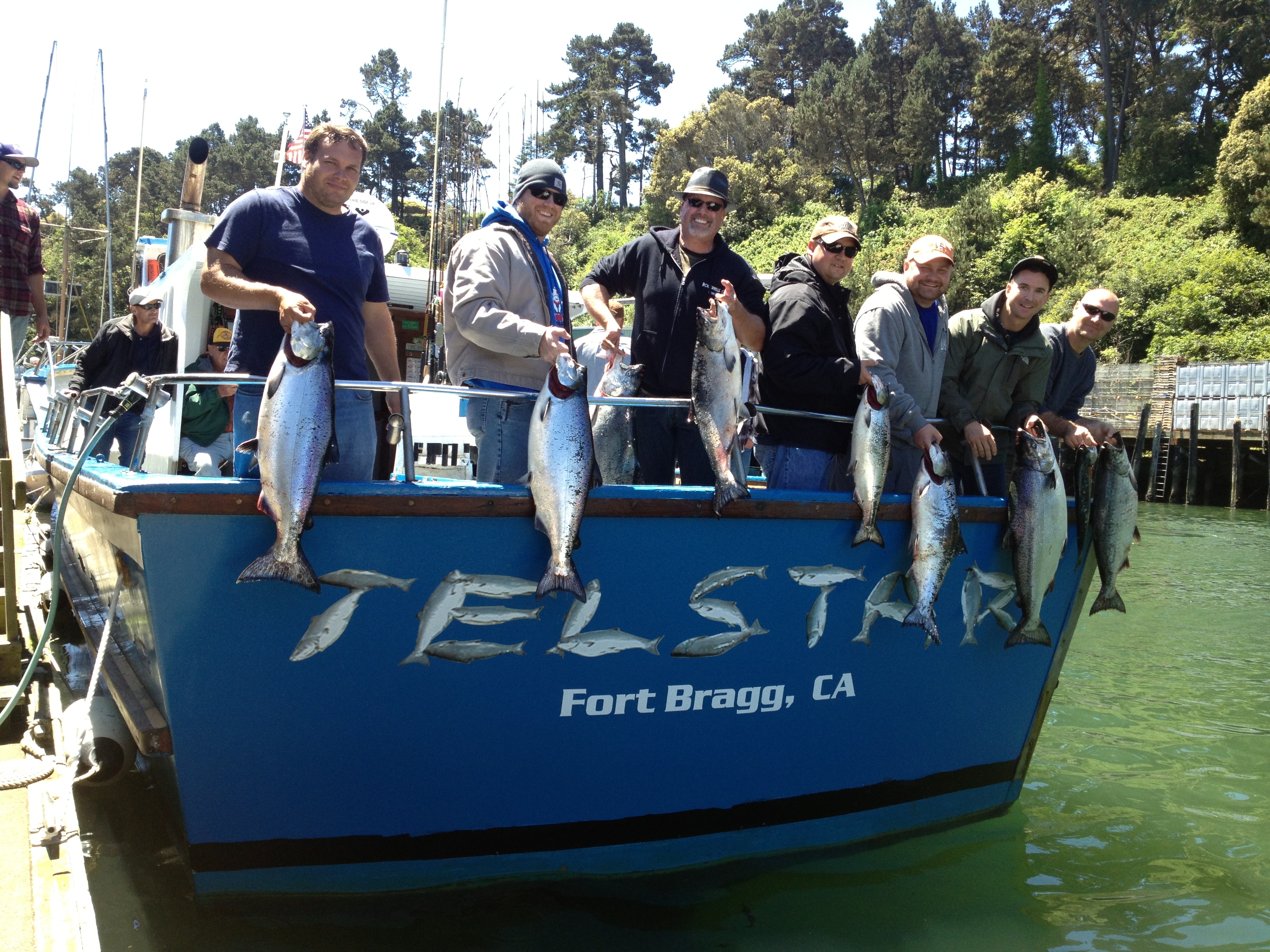 Friday June 28th, 2013– The salmon were right out in front of Noyo Harbor today. We trolled our usual arsenal of assorted hoochie’s and rotary killer’s and such the like. The one with the most activity was a j-71 hoochie over a cut anchovy behind a flasher 45 ft down with a 2lb ball. A hot pink hoochie was the runner up. We had a hard time keeping them in the water. The j-71 was hot through the next trip as well. I put the same exact set-up on the bow downrigger and put it at the same depth, and nothing. The next trip, the bow rod was the first to go off. It still didn’t land a fish until today. More on that later. We fished in 270 to 300 ft of water. Our final score was 9 salmon for 17 anglers. Nice grade too. We had 5 fish over 20 lbs! Big fish for the day are ; 20lbs caught by Josh L. out of Cloverdale. 21lbs caught by Ray Hayes from Menlo Park, 2-24lb landed by Brandon Austin out of Ukiah and Rob from Windsor, but the money fish was landed by Matt Masciovini. Good job guy’s.    Fish-On!
