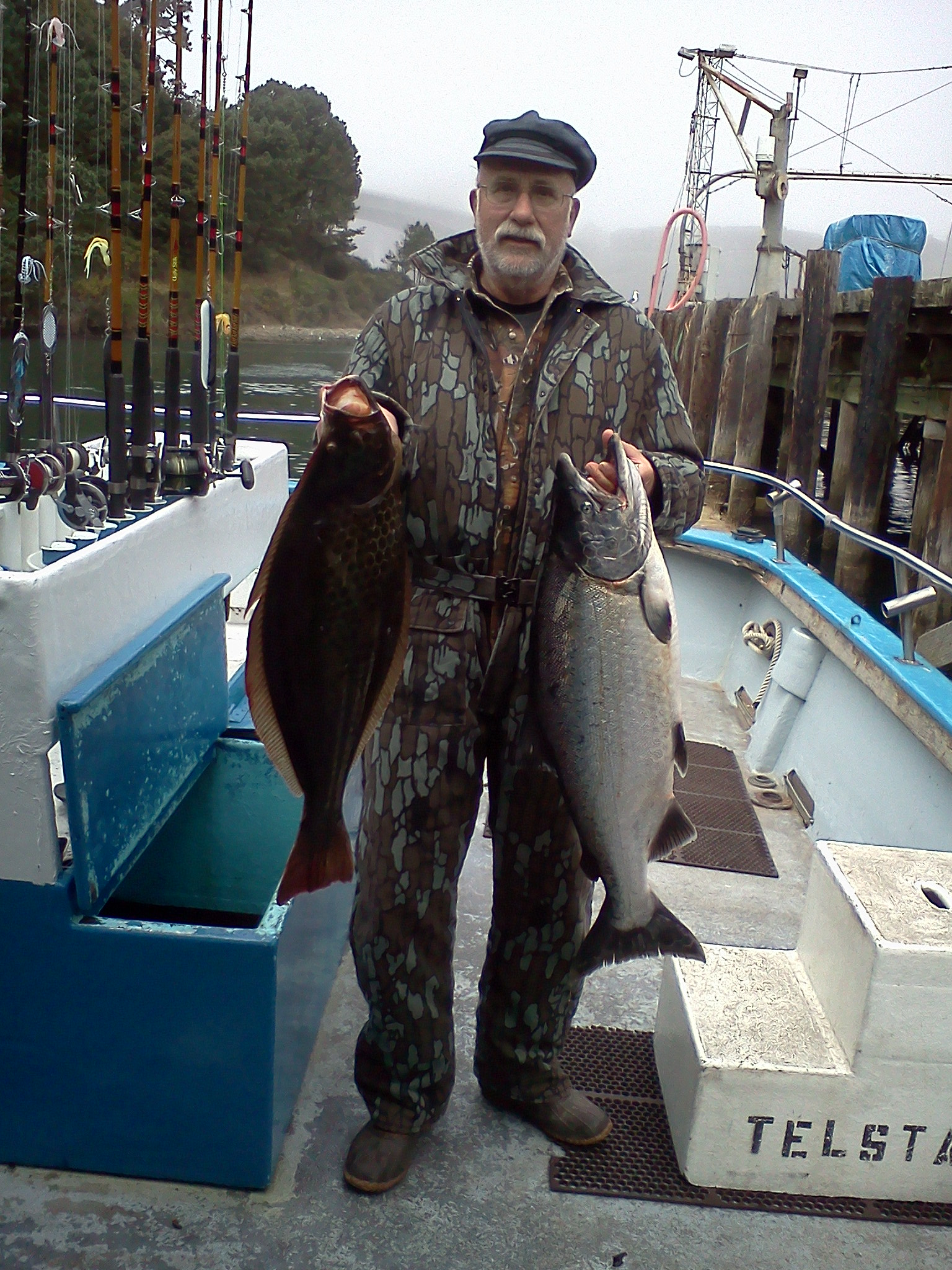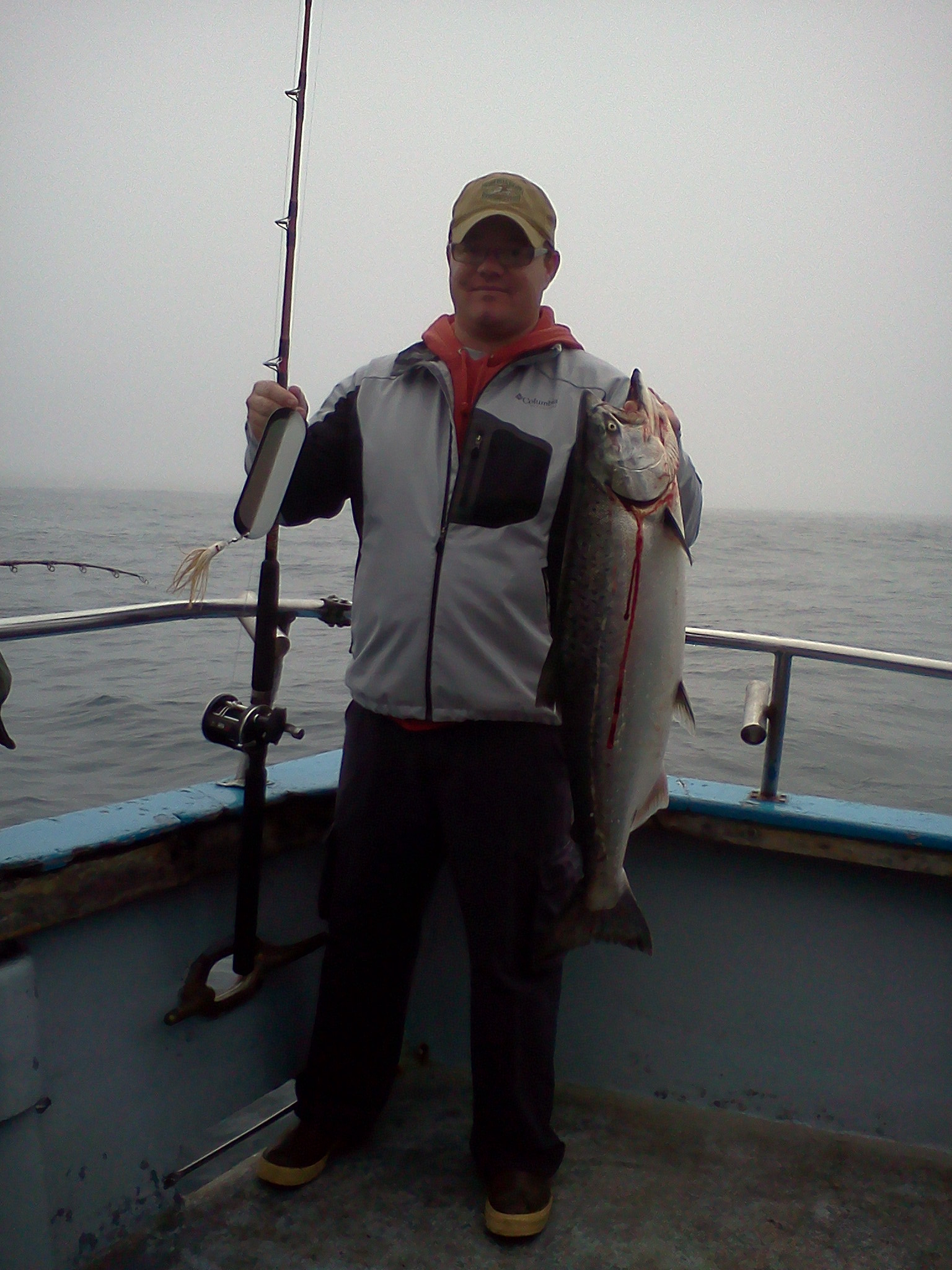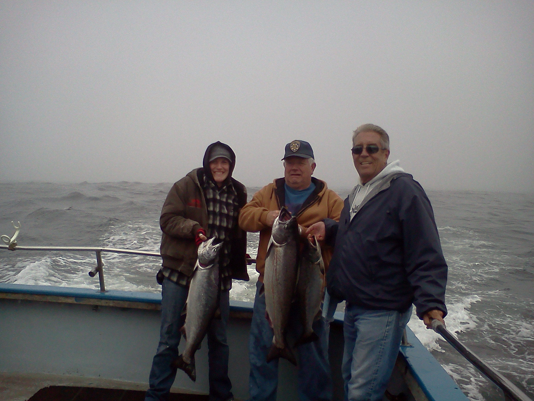 Saturday September 3rd, 2011 — After taking a few needed days off, I loaded up some more anglers and headed up north where I had some salmon last Sunday. The ocean was flat and the fog was thick. We managed to catch a few fish. Biggest one weighed in at 24 lbs. caught by Bill Hill from Marysville. On the left in the picture is Teresa Jones from Fort Bragg with her 18 pound king. Happy Birthday Teresa. On the right is Arthur Baxley out of Concord. Bill caught the big one trolling at 45 pulls with a 2 lb ball dragging a mini purple haze behind a flasher. We also lost 3 or 4 keepers.