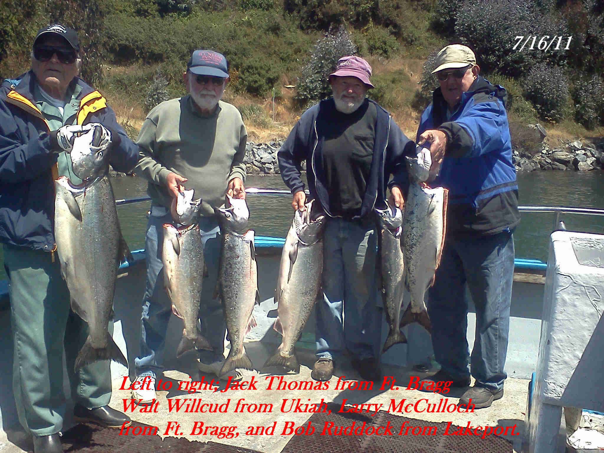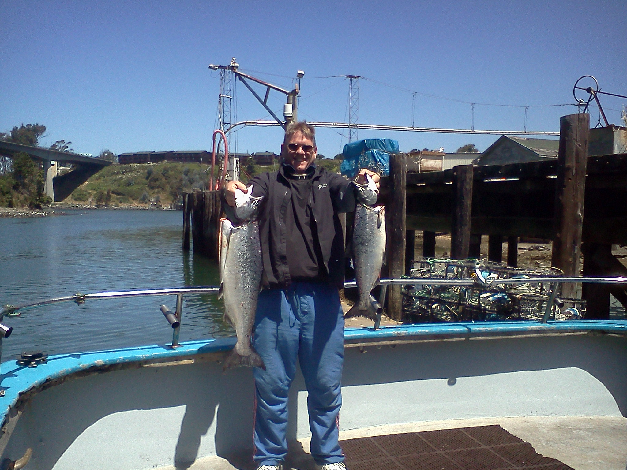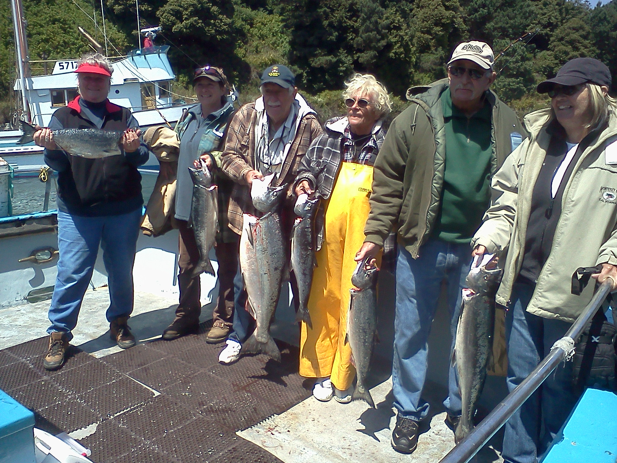 P.M. trip for salmon proved to be successful. I received a report yesterday that there were some salmon caught right out front but down deep. So I spent some effort and mounted two downriggers on the stern of my boat. This afternoon I went looking for the salmon deep. It turned out the salmon decided to come up for the afternoon. We caught most of our fish on the mid ship rods. They were fishing 40 to 60 feet down with a 10 lb lead on a downrigger. Smaller fish than we’re used to, however with the slow bite we’ve had lately, any keeper is a nice sight. We ended up with 9 salmon for 11 anglers. We lost a few and released a couple of silvers. Overall, we had lots of action. Gabe Newbrun-mintz landed the biggest one weighing in at 13 lbs. Gabe is seen here showing off our catch. Nice job Gabe!! Fish-On!