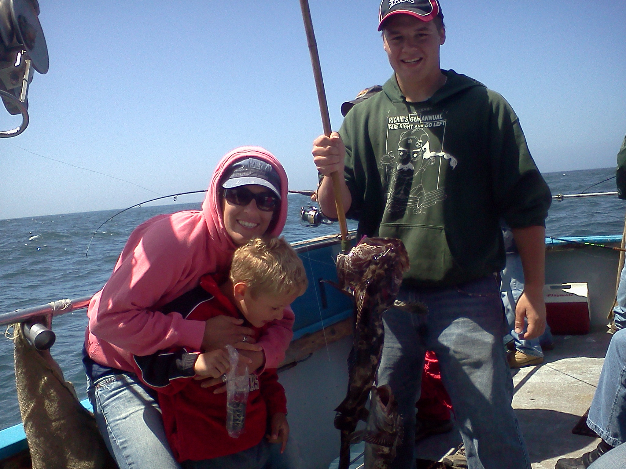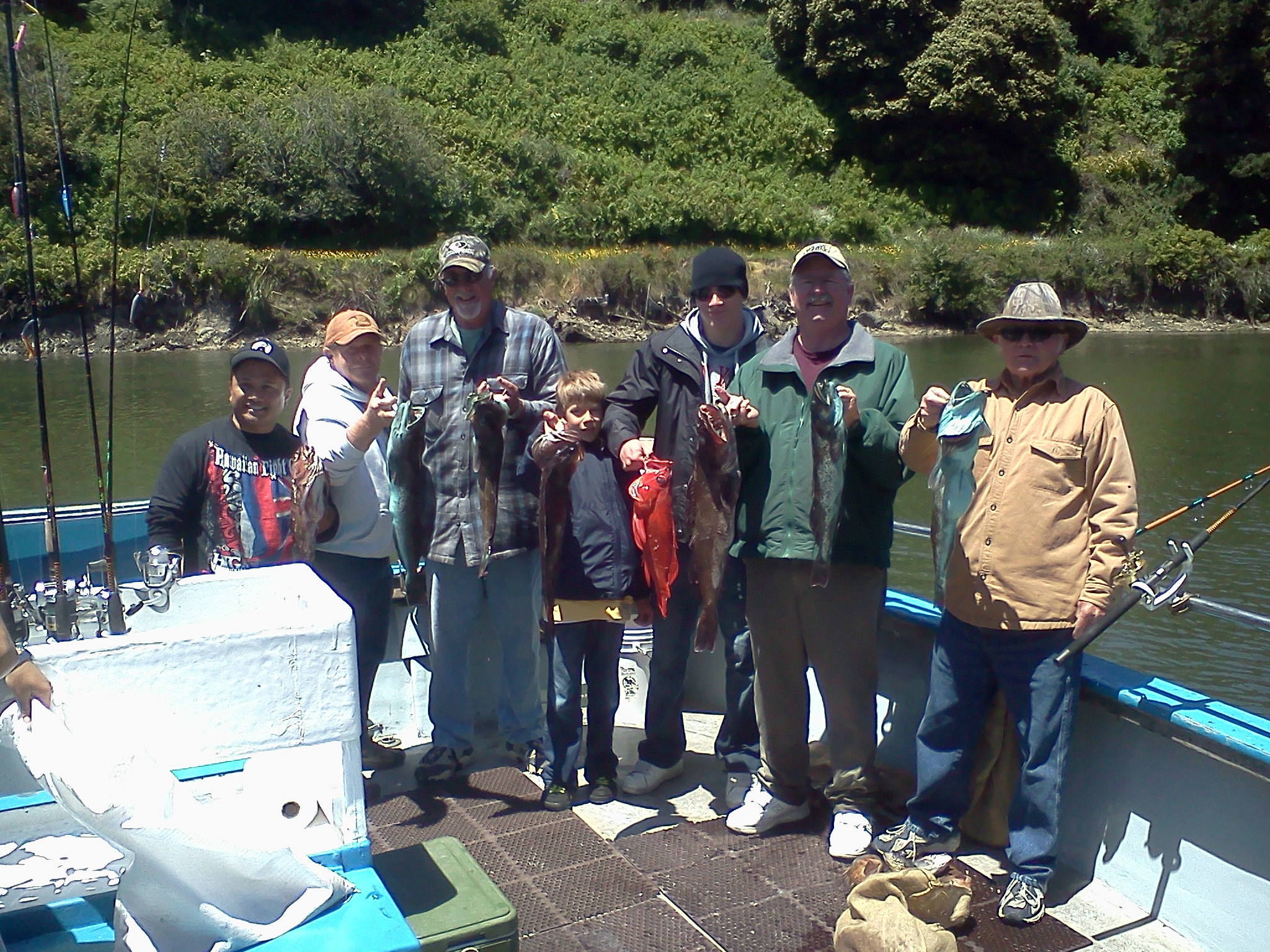 We went out today looking for some hungry rockfish. We found lots of rockfish, but not too many hungry rockfish. The salmon water was in and the rockfish don’t like to bite in the salmon water. I tried a bunch of spots north to just above the reef and finally decided to run all the way back down and try just south of the harbor. I wanted to go south to start with, but with all this wind we’ve had out of the northwest, and the ride I put up with the last time, I was hesitant. By 10:00 the winds haven’t come in yet so off we go looking for some clear water. It wasn’t near as brown south and I think it payed off. I don’t think we ended up with half limits for an average, but we definitely caught most of our fish in the last half hour. Some anglers caught 5 fish at our last spot. Cory Richards and her 6 year old son from Ordbend Ca. had a team effort in landing this double of ling cod. The bottom one was just under size, but the top one was dinner.