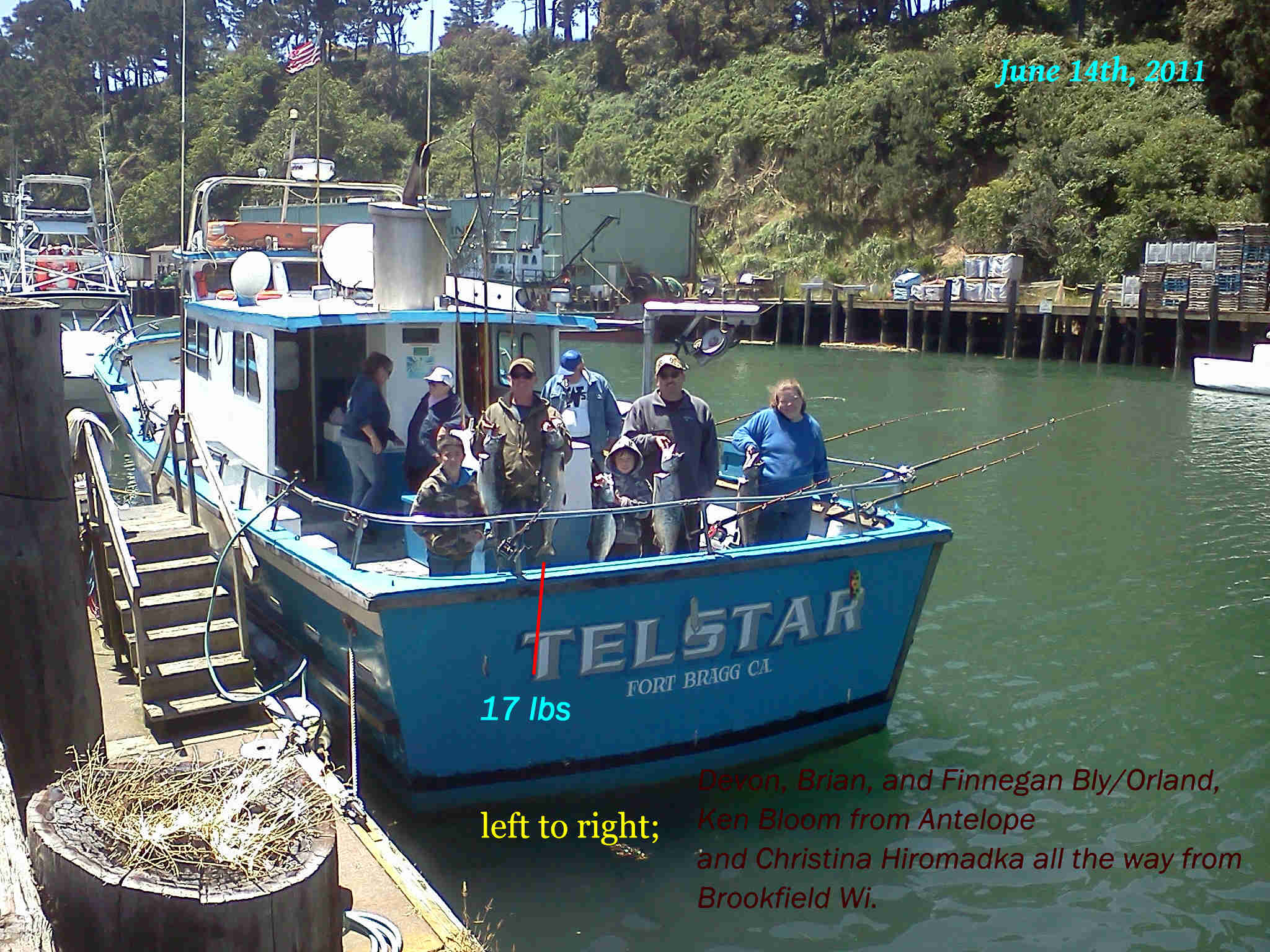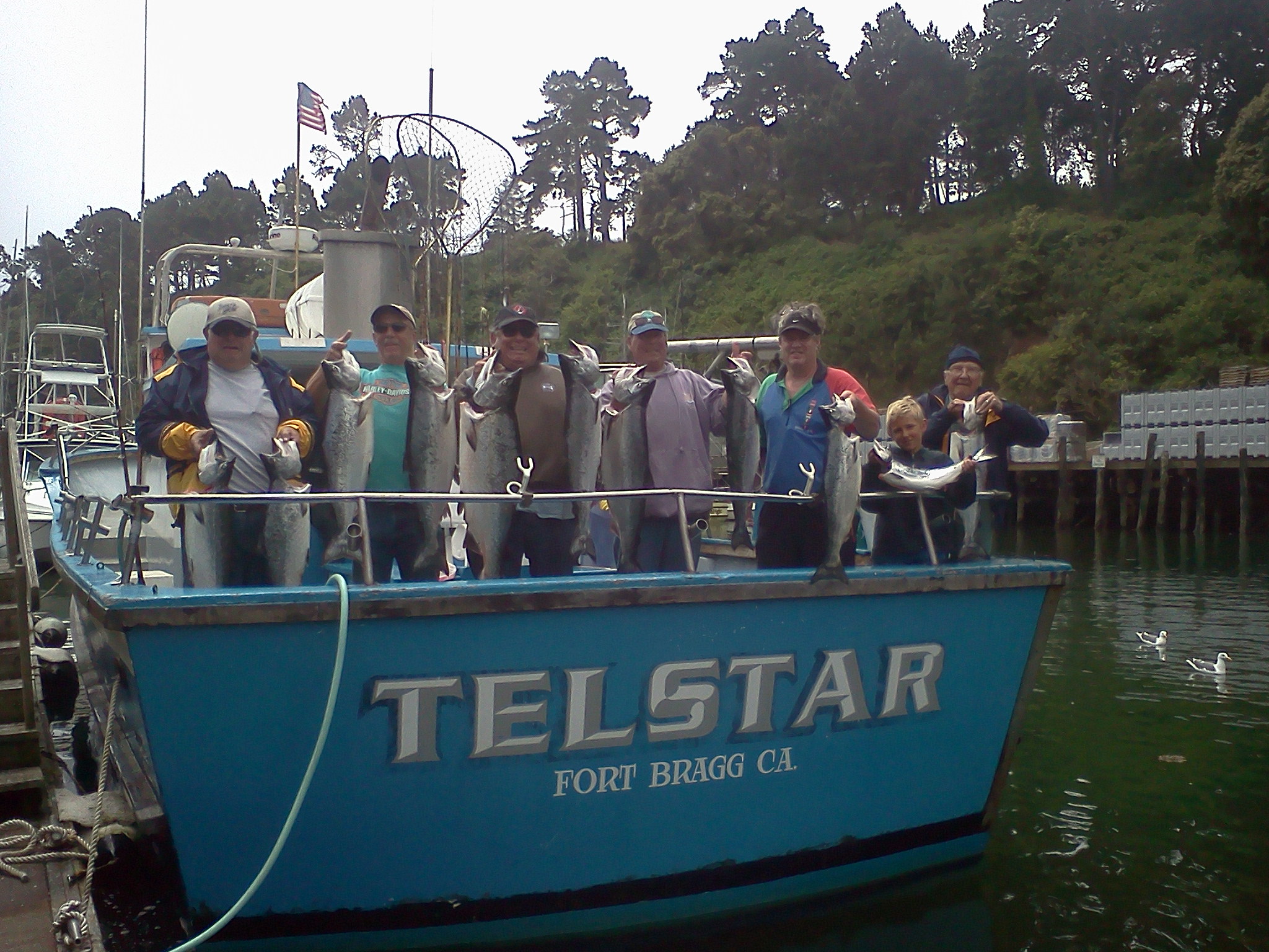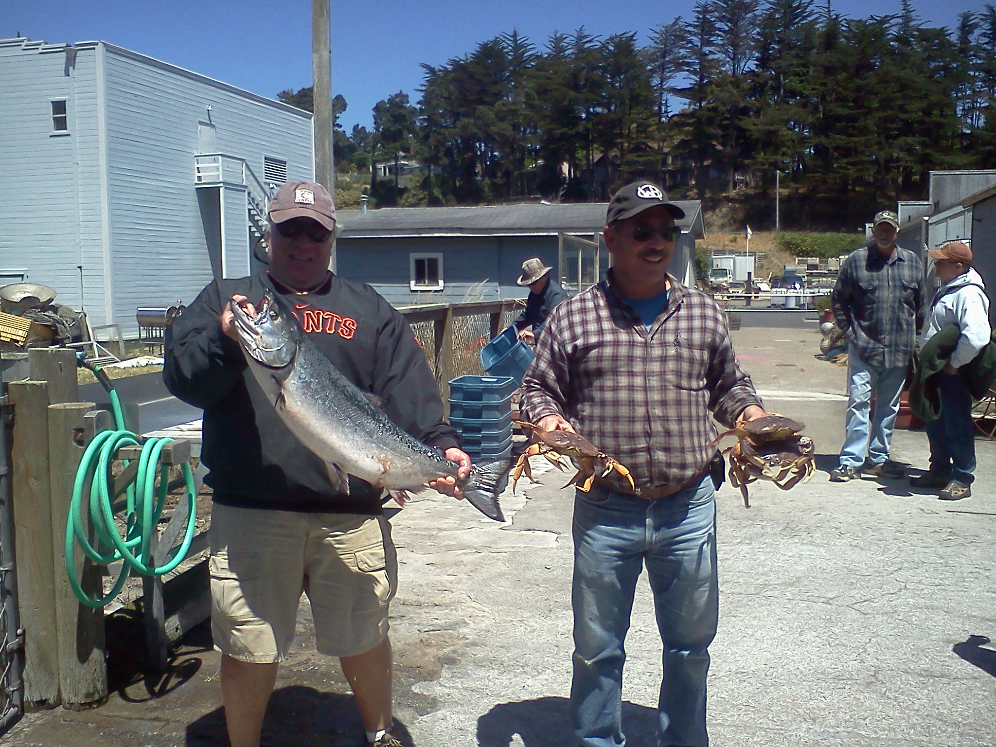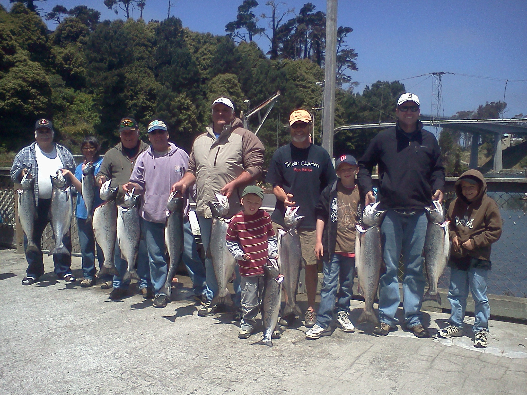 6/12/11 — First, a quick rundown on my past fishing. I haven’t fished for salmon for the past several days. I have been doing rockfish/crab combo’s. Pretty much the same report as before. Fished north and had 6 or more lings per trip with an average of 3/4 limits of rockfish. The grade of rockfish has been excellent with some black rockfish pushing 5 pounds! Great fun on light tackle. Picture; company trip (Pacific Supply Santa Rosa/San Rafael) showing off some good groceries. Trip was on 6/11. Crabbing has still been great! Now for the Salmon report; The salmon started biting the day before yesterday with the bite increasing by the day. Today’s report was most of the private boats were on their way in by 9:00 with limits of nice salmon. Largest one I heard of was 36 pounds caught out of Albion. I heard of lots of 25 pounders landed right out front of Noyo Harbor. Tomorrow I have 2 salmon trips so I should have a report up early evening. Wish us luck! Fish-On!