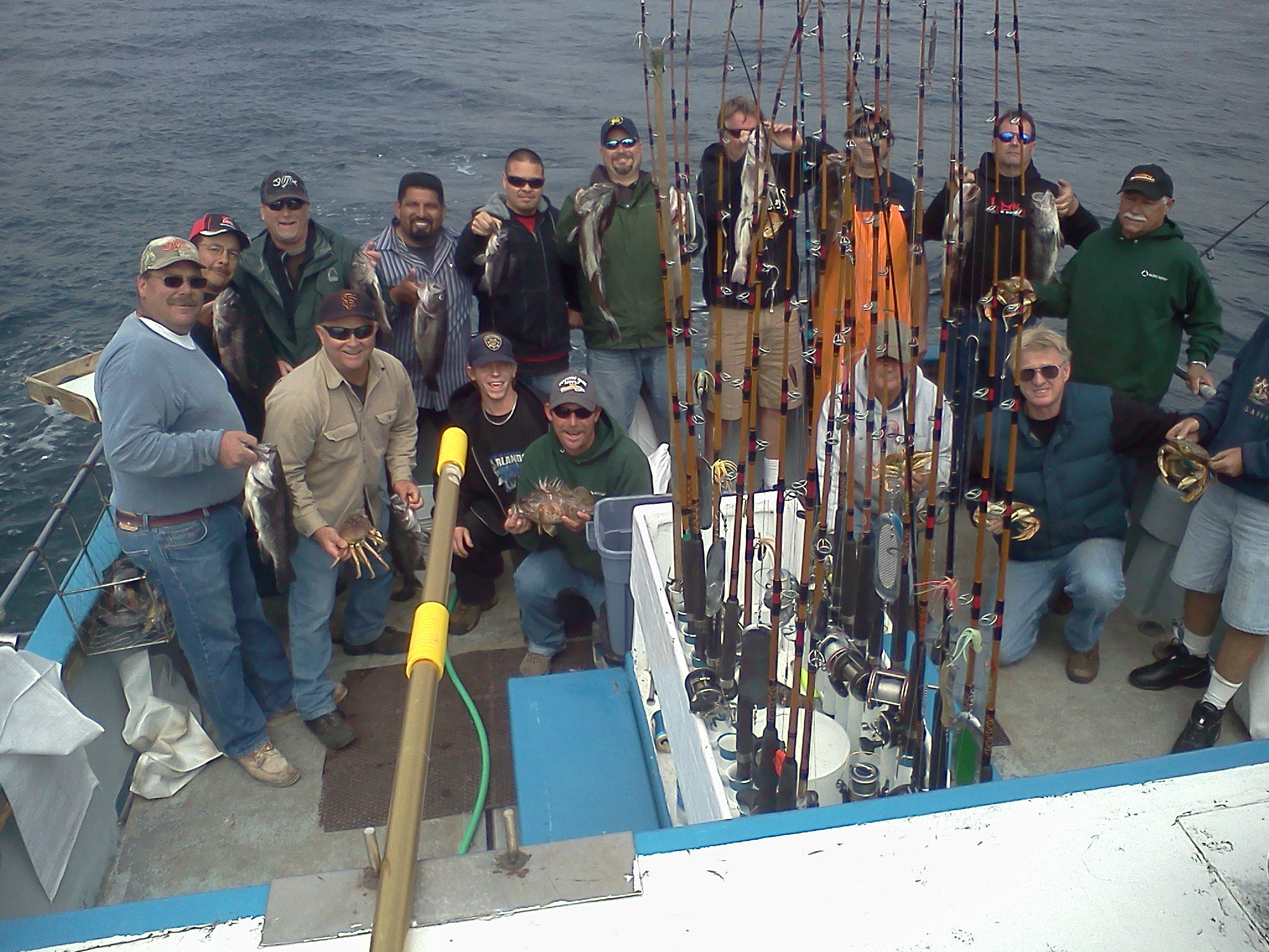 June 22nd, 2011 — The Telstar* went south fishing for rockfish and lingcod. We had some pretty fair action today and the weather was good too! We ended up with 3/4 limits of rockfish for 16 anglers and 1/2 dozen keeper lings! Biggest one was about 10 pounds. Great variety today. Some bags had 7 different species in them. Conditions were acceptable. The water was a bit cold at 49 degrees. I went south looking for some clear water and we found that. We jumped quite a few spots working south and ended up fishing the last part of our trip just north of Mendocino in 50 to 70 feet of water. The wind stayed out till the end of the trip. Fun was had by all. Fish-On! Picture from left to right; Rick DeJesus/Temecula Ca., Dan Williams/Diamond Springs, Glen Rosenthal/Valley Springs Ca., Devon Davis/Roseville, Tim Grooms/Roseville, Leon Vann(Big fish pot winner)/Elk Grove, and Arnie Larson/Reno Nv.