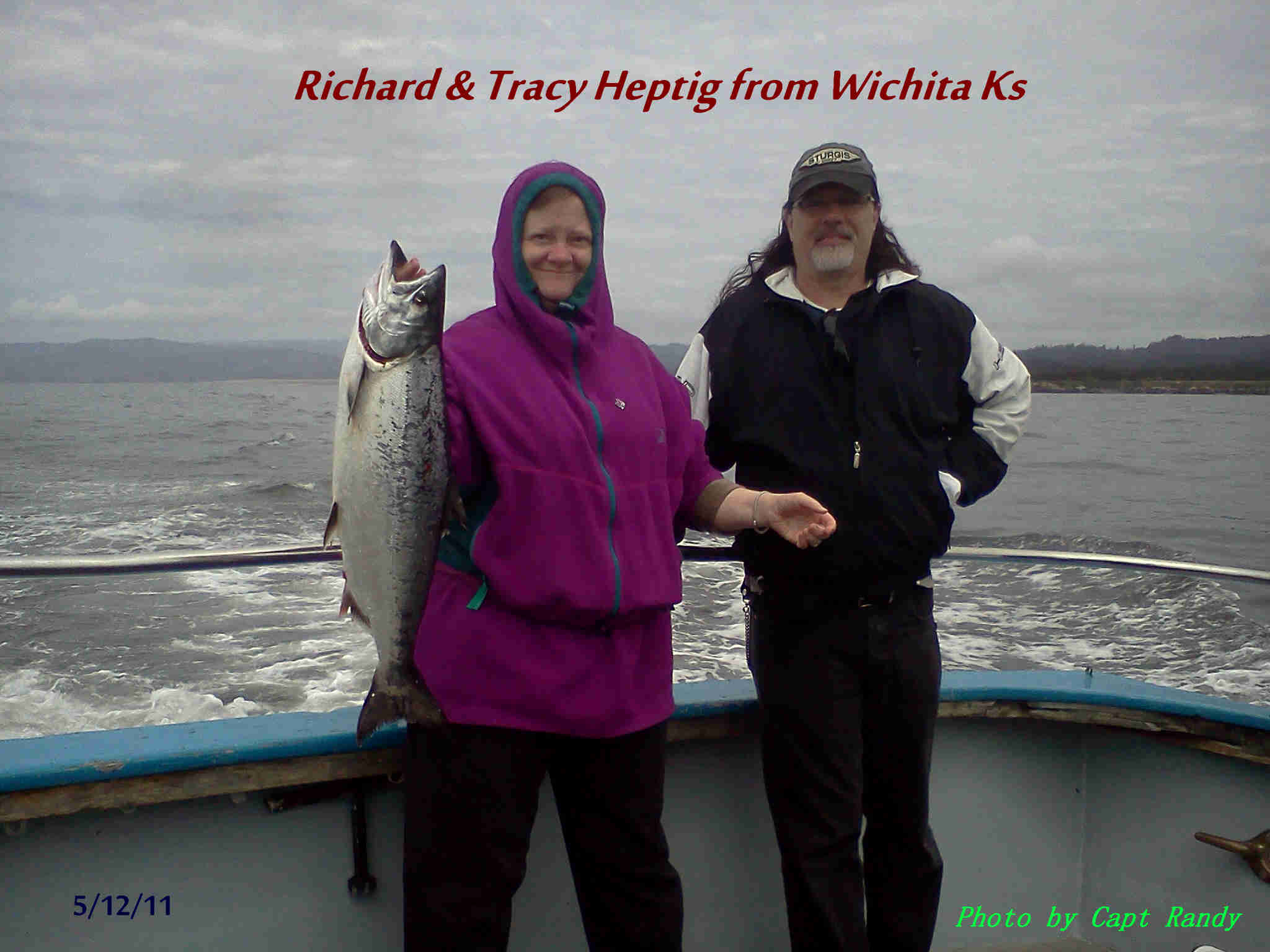 May 11th, 2011 report– Fishing was pretty slow today. The ocean was flat and the winds were calm. First I dropped 20 crab pots up north on the beach in about 20-25 ft of water. I figured that by the time we were done with that I might hear of a good fishing spot. Not so. So we ran west till I found some bait and put in our salmon gear. Not much action getting reported from all my feelers out there. Not much happening where I’m at. The water temp is a bit cool (48 degrees). Finally we hooked up are one and only bit of action. Richard and Tracy our on their honeymoon from Wichita and would like nothing better than to taste some of our fresh wild ocean caught salmon. Well, there you have it! Tracy scored! A nice 9 pound king. Just right for eating. Good job Tracy. At about 12:30 I decided to go in and run our crab pots. 84 nice jumbo’s. 8 around for everybody on the crabs!!! Thank goodness for the good crabbing! Fish-On!