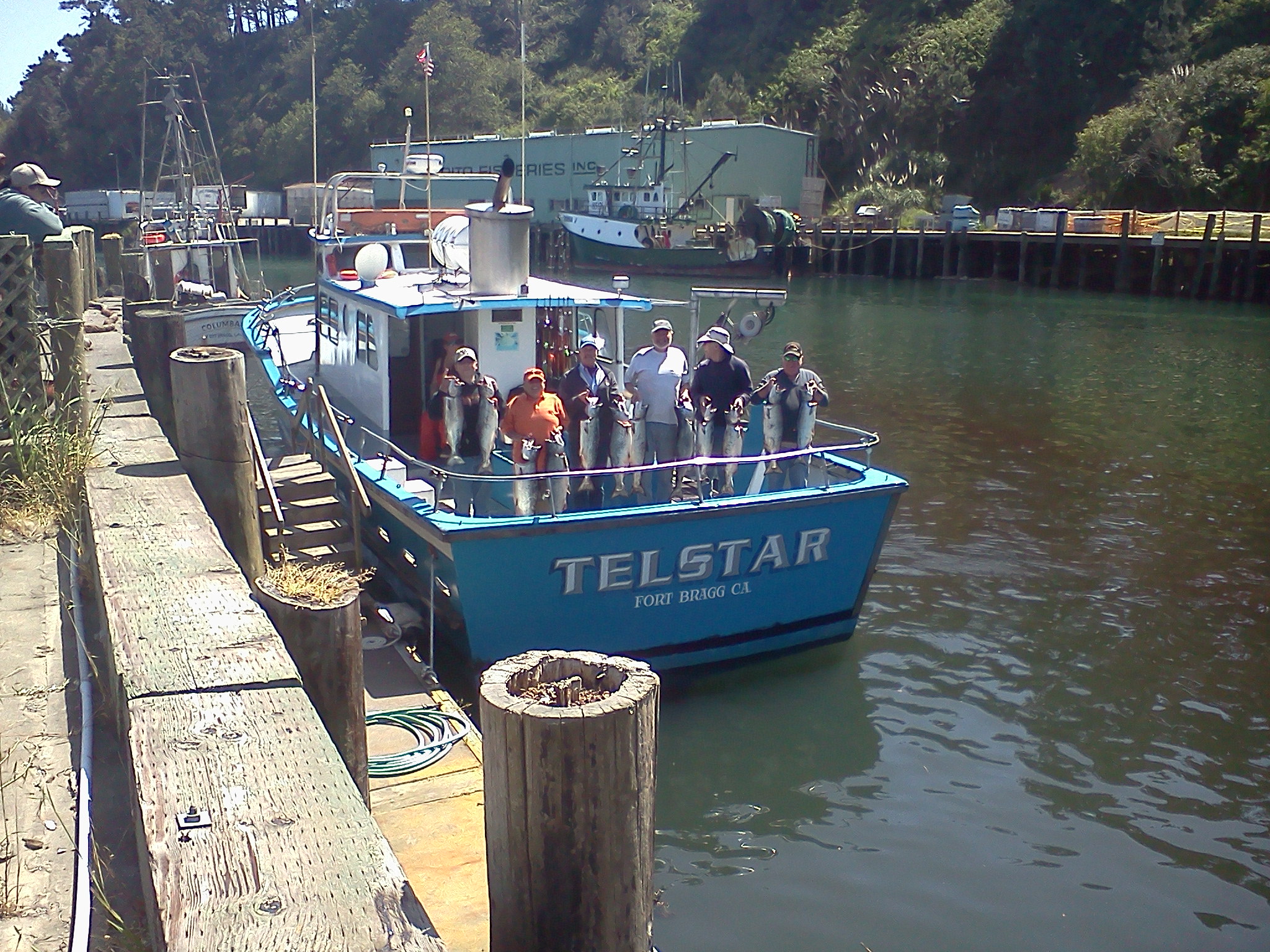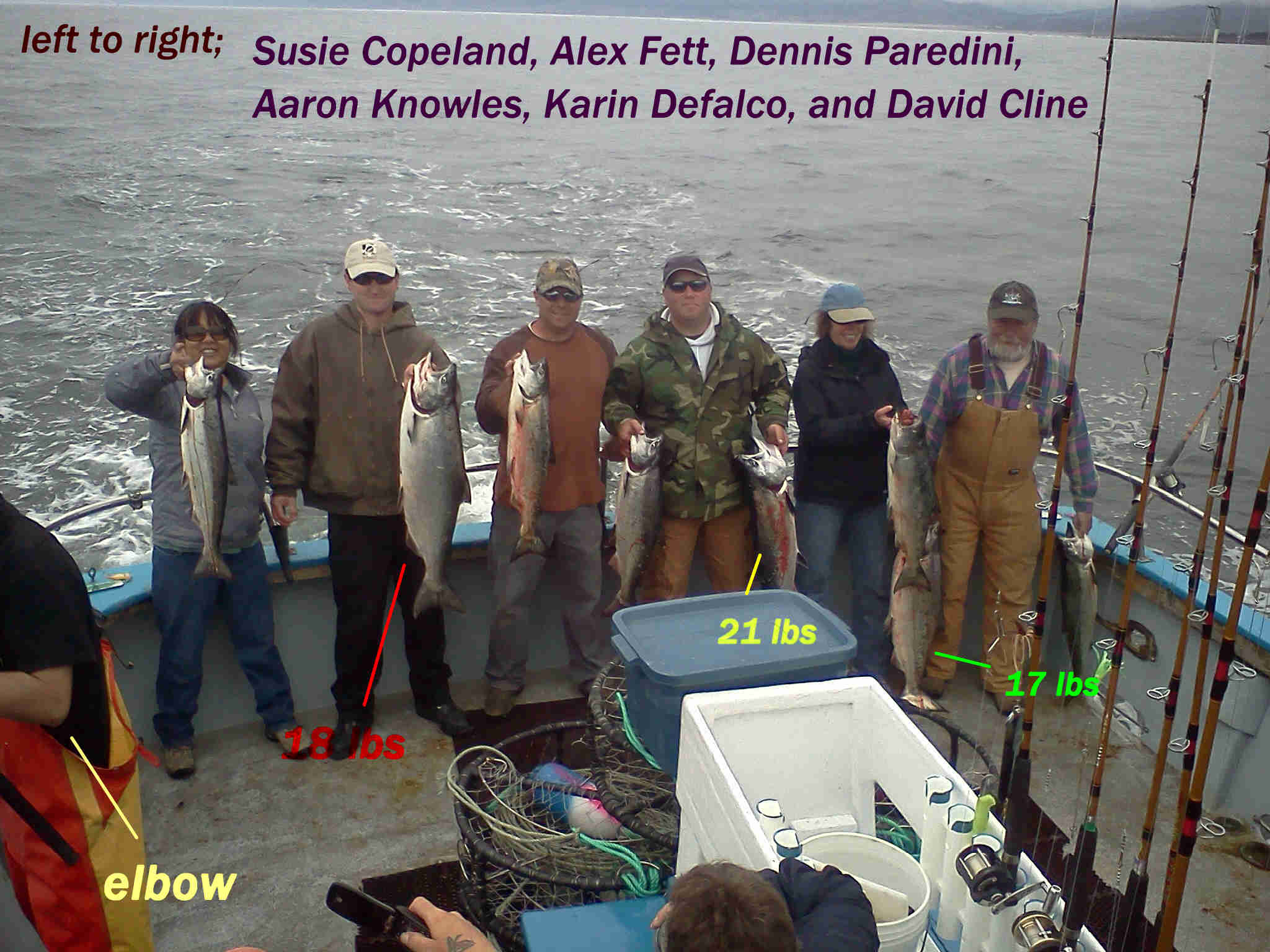 a.m.– I thought we’d give the crabs a break today and just concentrate on the salmon. We had some action as well as most of the boats out on the water. Our problem was keeping them on the line long enough to put them in the boat. We fished north and south of the whistle buoy but not more than a mile. I stayed in about 200 to 240 ft of water. Nothing in particular was the hot ticket. Most everything we put in the water had some action. Our score was 5 fish in the boat and lost 7 and released 1 shaker. The ocean was flat and very enjoyable to be on. Local Dennis Barney won the fish pot with a 12 pound king. The smallest one weighed in at 9 lbs. Left to Right; regular Susie Copeland, Carrie Lees (local), Dennis Barney (local), Steve Heindl from Lakeport and Rusty Hays from Mendocino, Ca. Fun was had by all! Fish-On