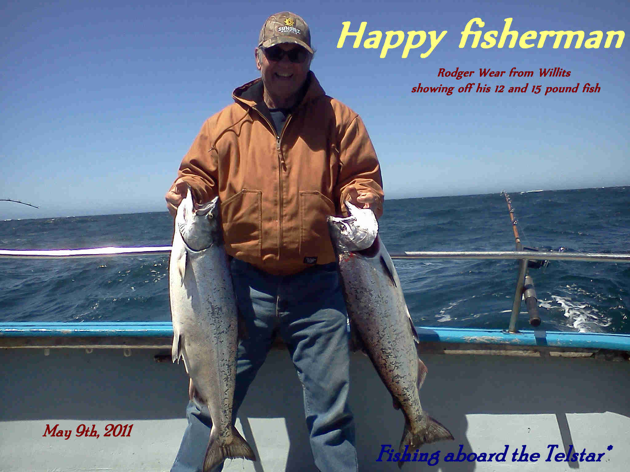 Ended up with a trip this afternoon. Ocean still flat. 7 anglers are trying their luck at capturing the infamous king salmon. Picked a double right away! Could it be an afternoon bite? Well, it turned out to be not too different from this mornings trip except we didn’t let as many fish get away. Ended up with 5 fish for 7 anglers and only lost 1. Fished the same area. The current is out of the north pretty strong. I hear there are some big fish up Shelter Cove way. Maybe this current will bring them our way. About the same grade as this morning too. Rex Parker from Janesville, Ca.(left), and Dennis