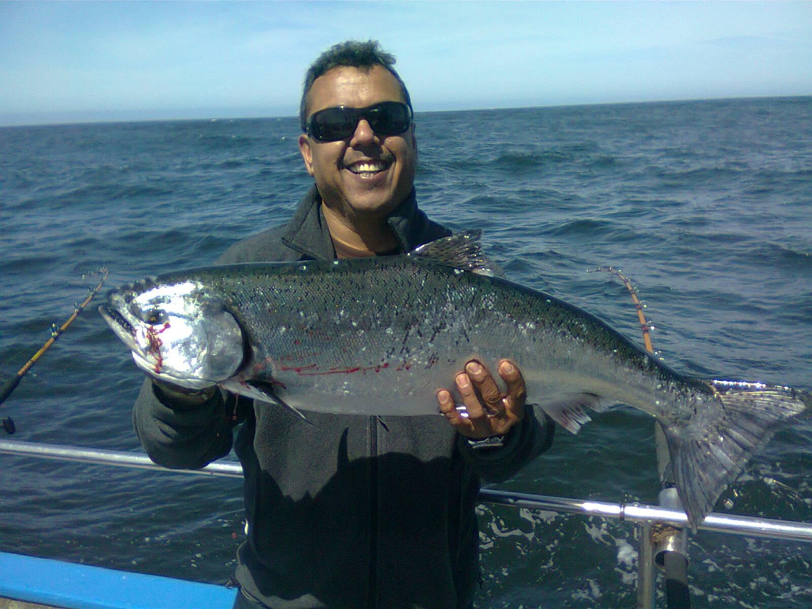 I have some folks who would like to add some crabs to the menu today so crab and salmon it is. Fished up north in my usual place. Fish not very hungry though. Sounds like there were some fish caught down by the buoy early. After crabbing first thing we tried for some salmon with no avail. Hoping maybe that there will be a late bite, I decided to go in and run our crab pots again. Our second run was better giving us a grand total of 92 crabs for 11 anglers. Then I decided to run down to the buoy and do some last minute fishing. As I was passing by my previous hot spot I noticed all kinds of birds. Pelican’s, murre’s, commorant’s, seagulls and the like. It looked good. I couldn’t pass it up so I stopped and chucked my lines in. At 1:00 we put our first salmon in and by the time we pulled our lines in at 3;30 we had landed a total of 8 kings!!! Good call! Fish-On!